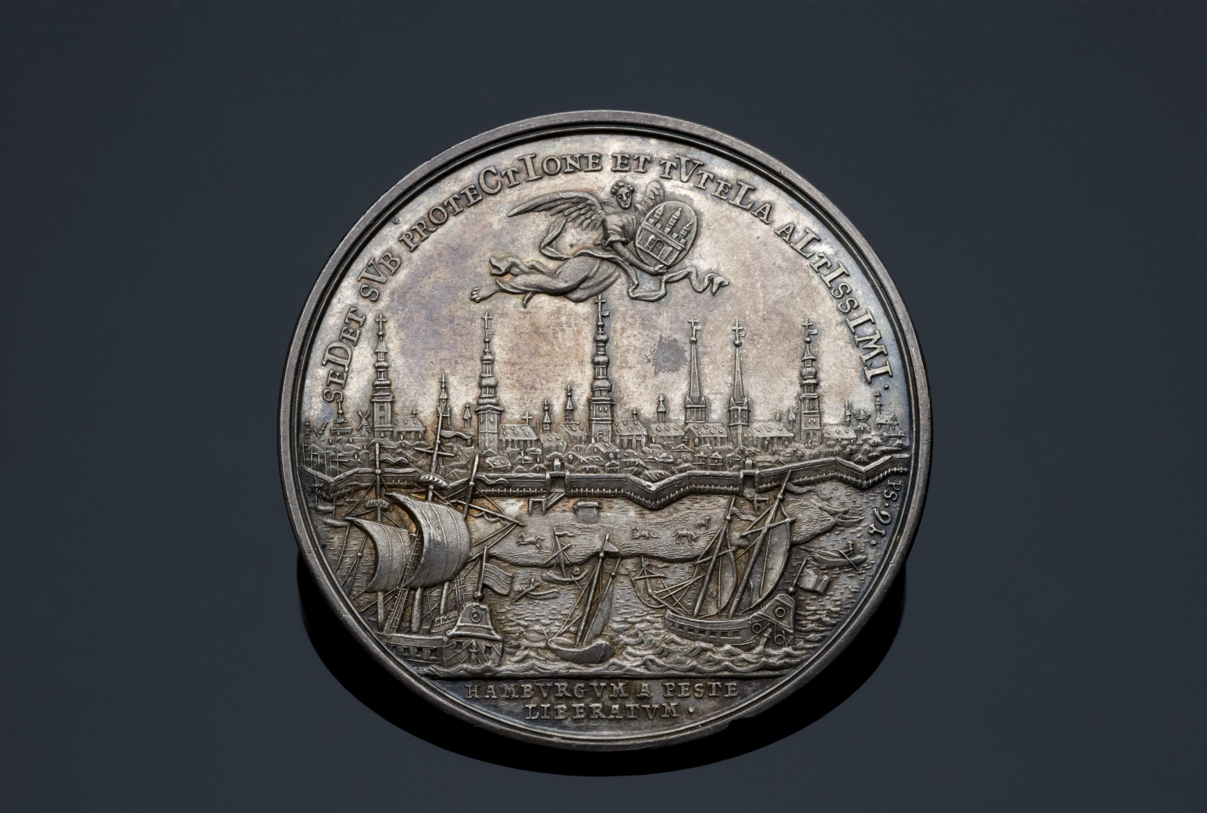 Silver medal commemorating the deliverance of the city of Hamburg from plague, German, c. 1714. [4033×2719] by chubachus