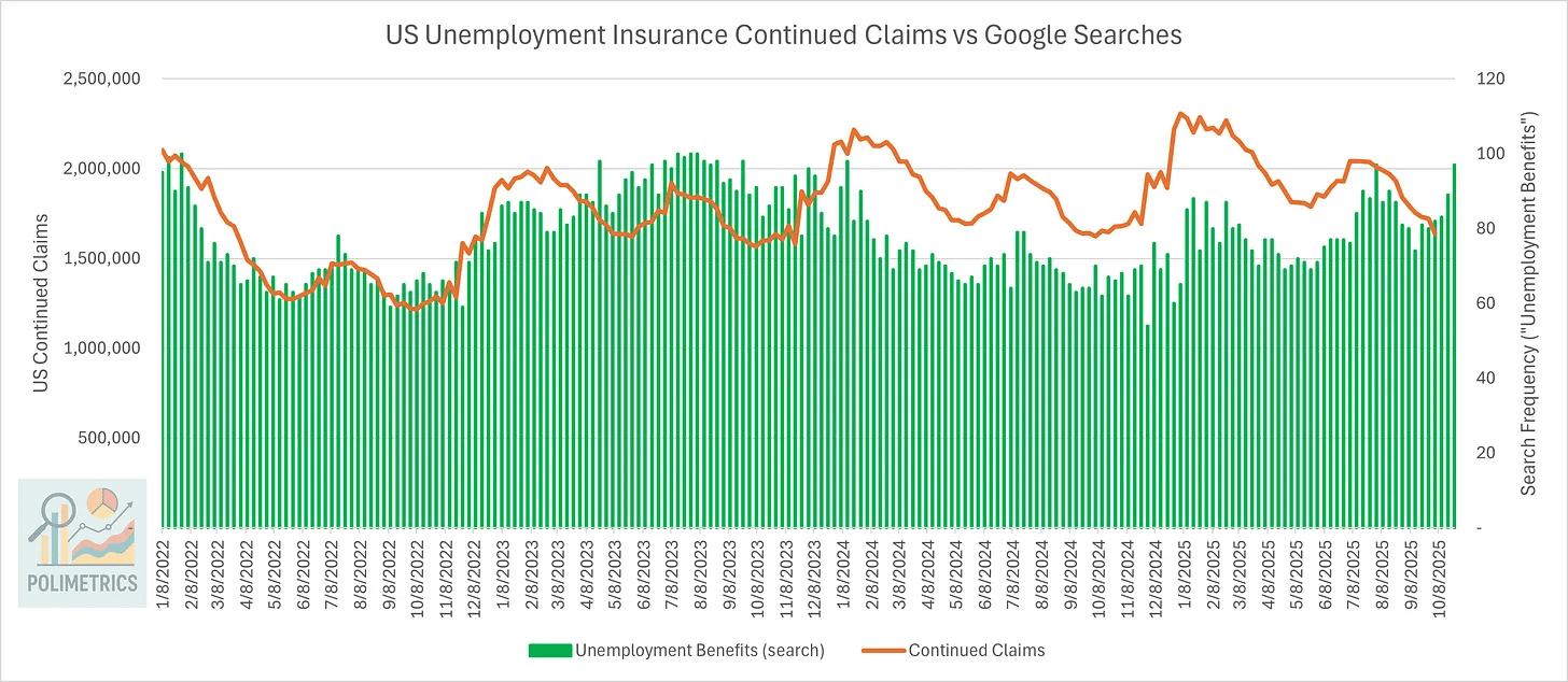 With the federal government shutdown, economic data that is typically released and reported on is not available. There was some research during the Covid-19 pandemic showing how Google Trends data on searches for terms like "unemployment benefits" could be used as a good predictor of unemployment claims, since there is about a 2-week lag in DOL's reporting.