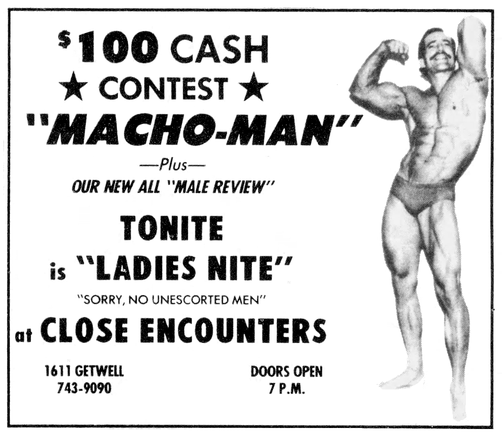 Home » Vintage Advertisements » Macho Man Contest at Close Encounters in Memphis – October 1979