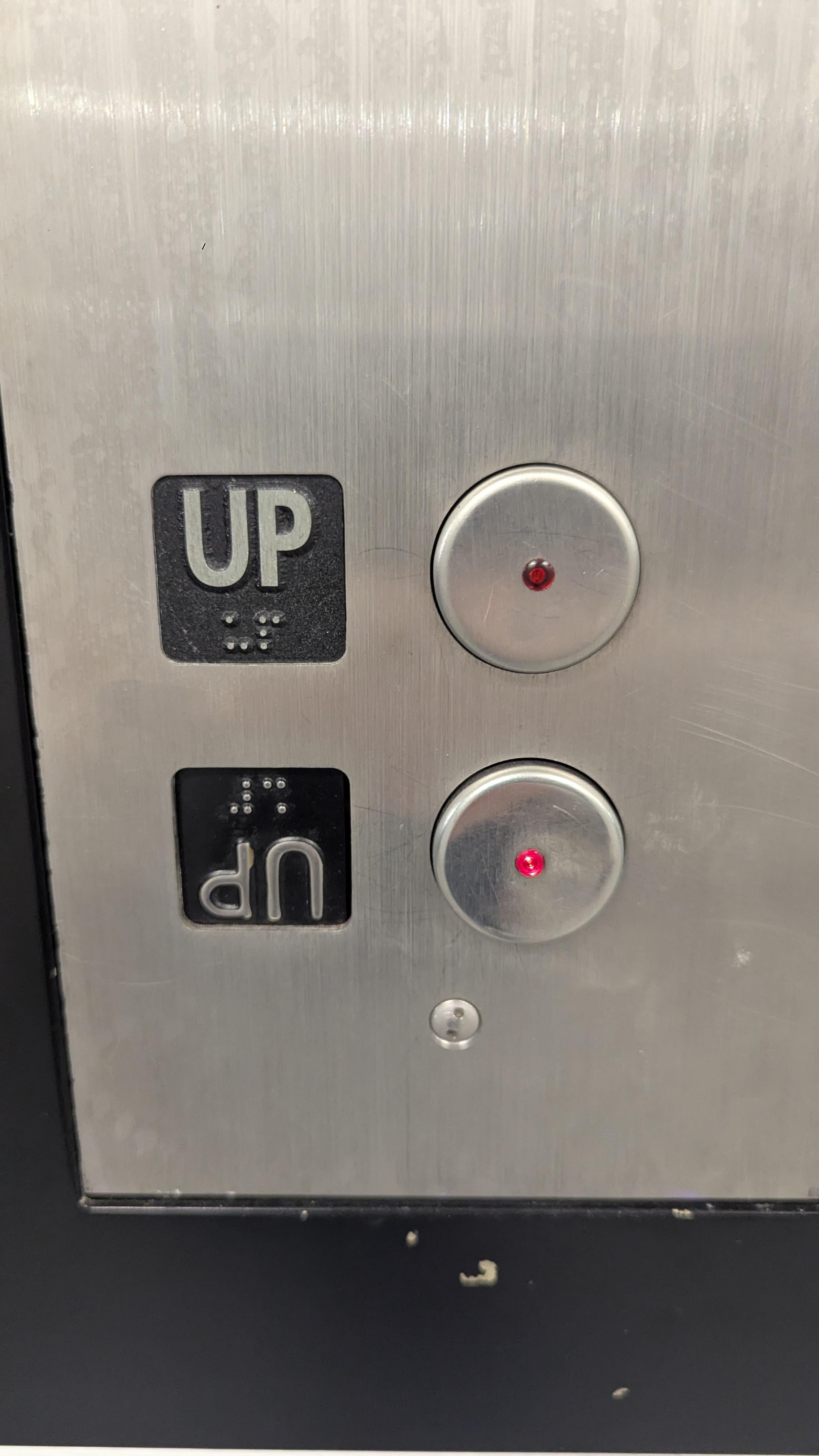 The implication would be clear to a blind person reading the braille. Two up buttons, one used as a filler for a missing down button. Unless it was a weightless environment.