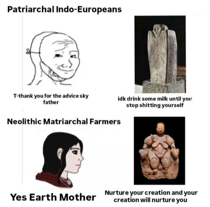 Everybody’s matriarchal until the chariot gang rolls into town praising Dyēus Ph₂tḗr and drinking milk.
