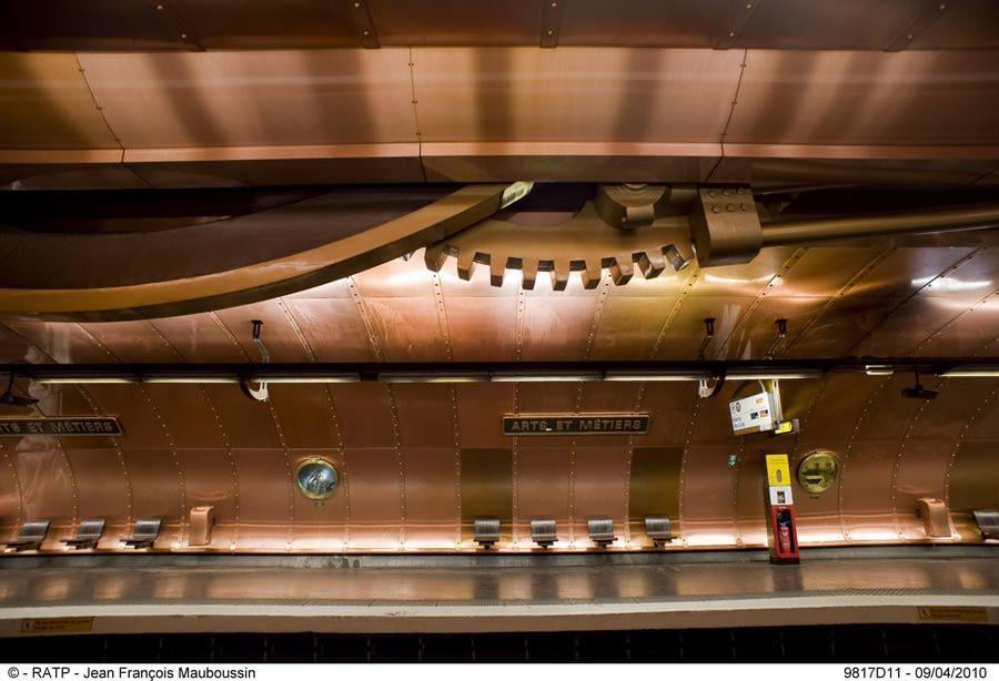 Just came about this Metro station in Paris. An ordinary station until 1994 when it was redesigned by belgium comic artist François Schuite. It‘s a bit hard to find a good web page, either they have a lot of cool pictures with french texts, or condensed dry information in english. So maybe try this: https://www.about-paris.com/art-et-metiers-metro.html