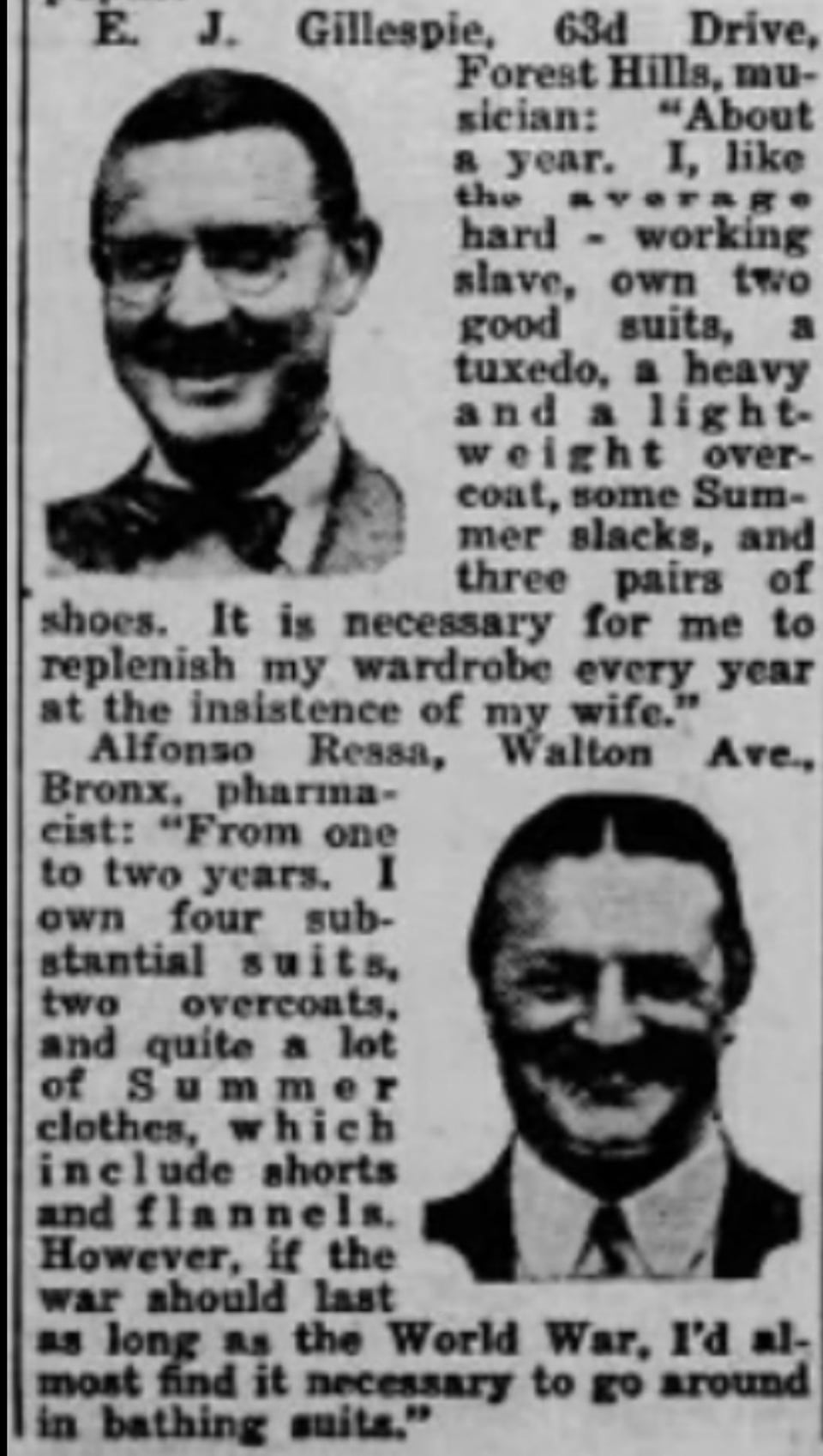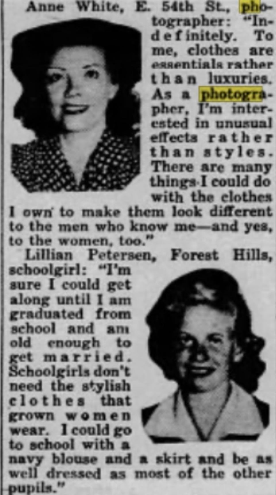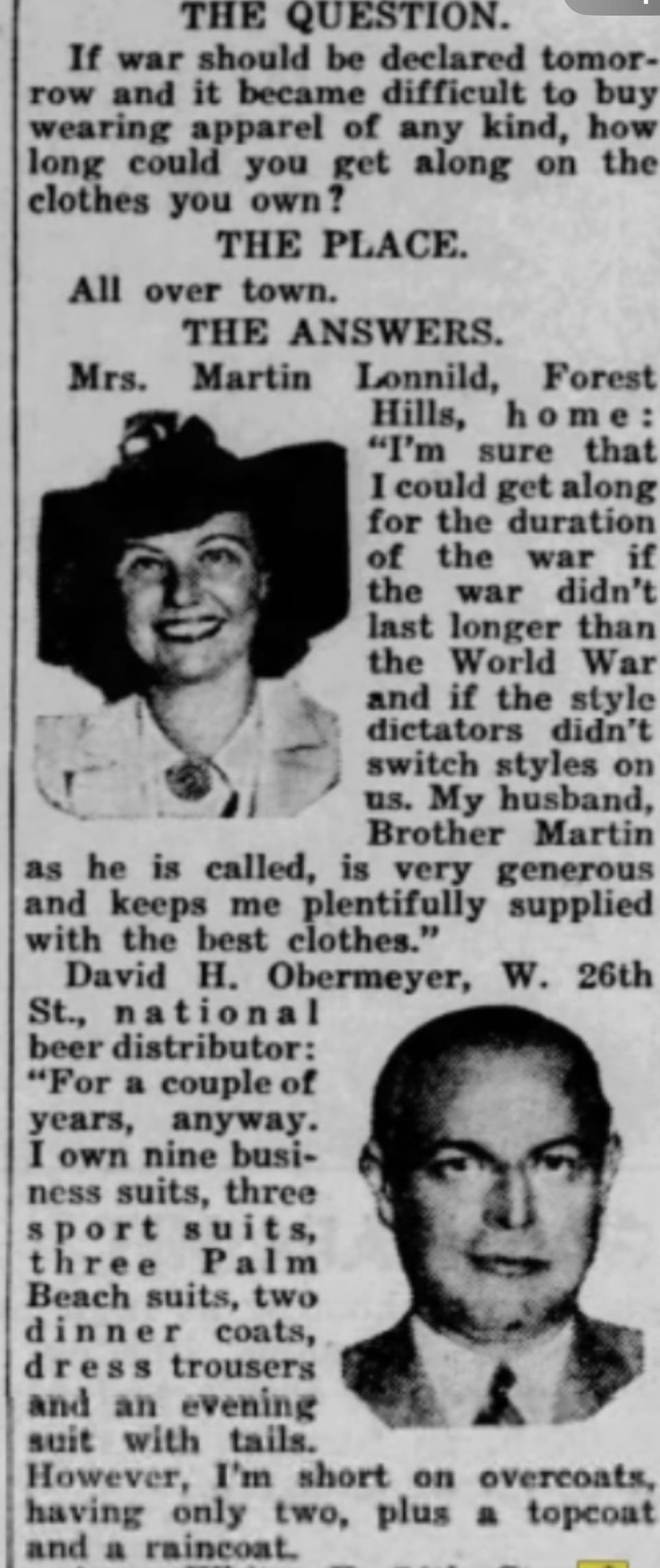 Inquiring Photographer:”If war should be declared tomorrow and it became difficult to buy wearing apparel of any kind, how long could you get along on the clothes you own?” August 27,1941.