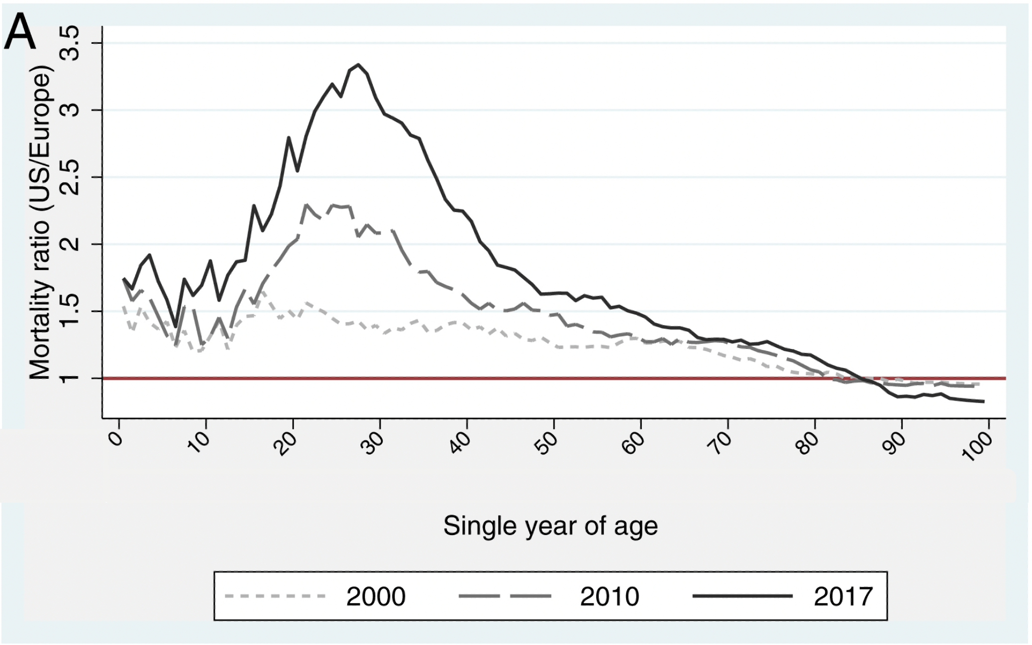 Americans in their 20s are more than 3X as likely to die as Western Europeans in their 20s. This mortality gap has exploded since 2000, when Americans in their 20s were just <50% more likely to die than Western Europeans in their 20s. Americans are more likely to die at all ages except, oddly, 85+