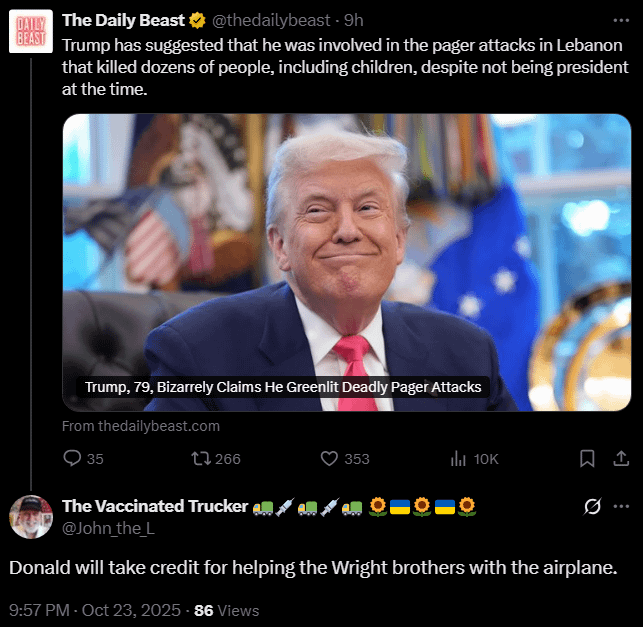 brokeboipobre on October 24, 2025 4:55 am Trump said he was with George Washington, when he crossed the Delaware River. “George Washington was a great guy! Tremendous guy! Trump even created the plan to cross the river and Washington said it was a tremendous idea!”