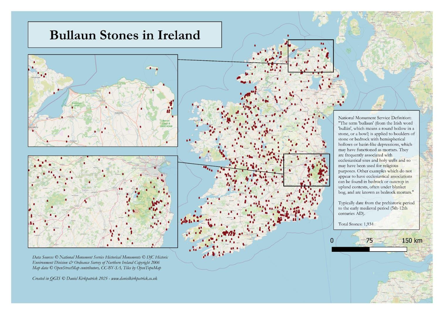 Here are all recorded bullaun stone locations across the whole of Ireland. The map is populated with a combination of National Monument Service data (Republic of Ireland) and Department for Communities data for Northern Ireland. The map was built using some PowerQuery transformations and then designed in QGIS.