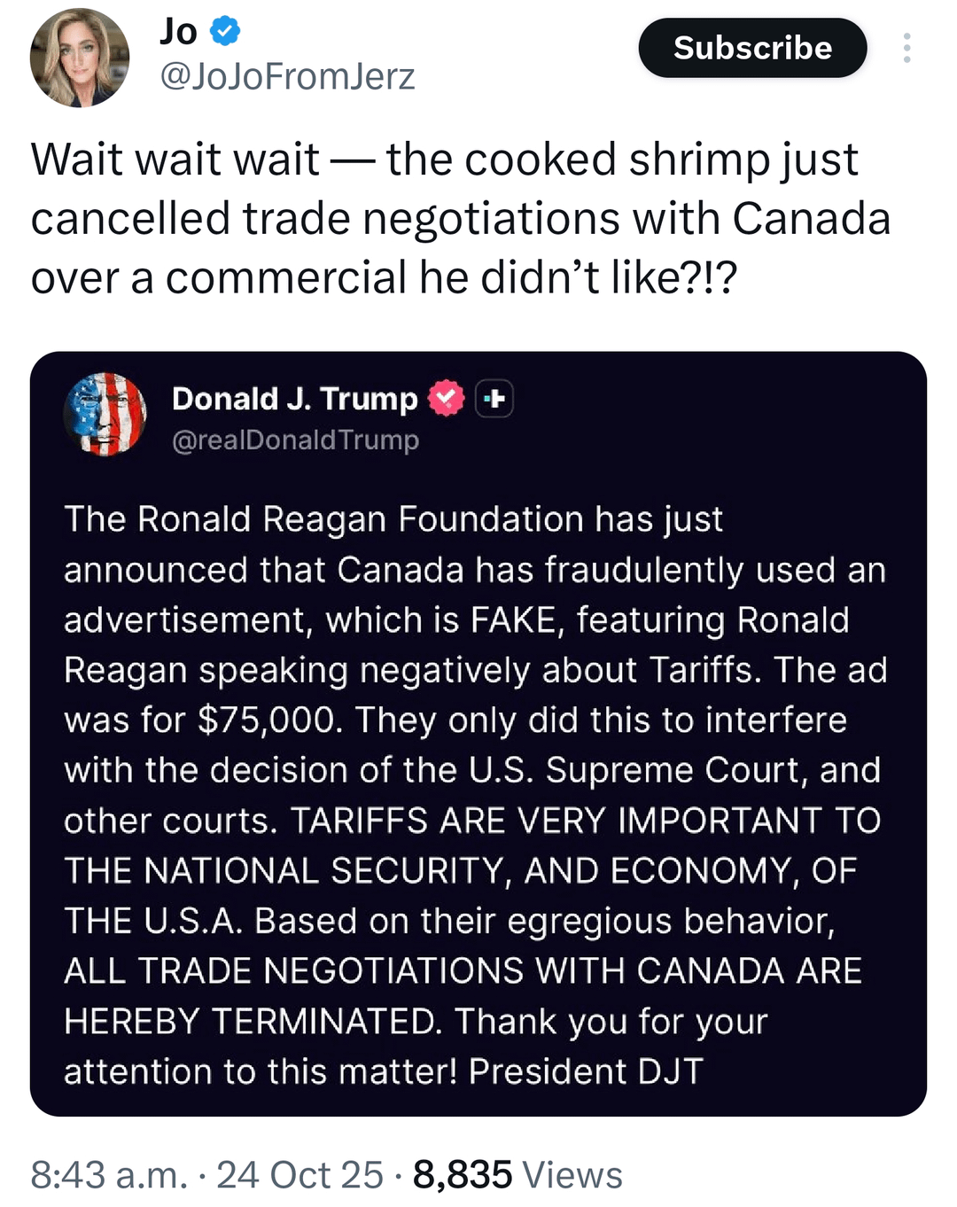 11. This shit makes me laugh as a Canadian. I give him a week and he’ll changed his mind and come crawling back.