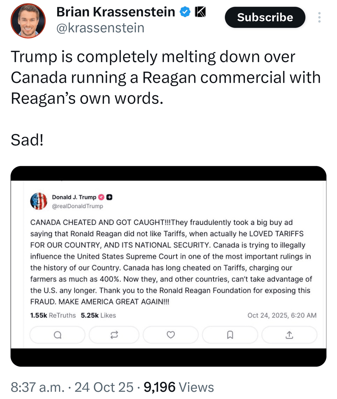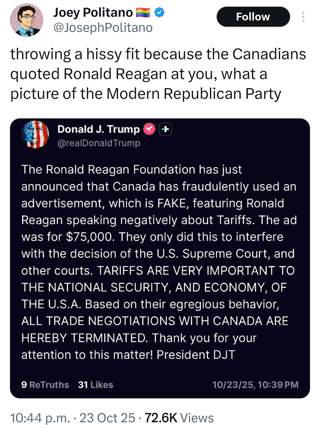 7. The absolute best part of the ad is that it’s just Reagan speaking, submitted without comment. There is no editorial. No text on the screen. Nothing. Just Reagan’s speech. That is what they’re infuriated about: hearing Ronald Reagan talk about tariffs.