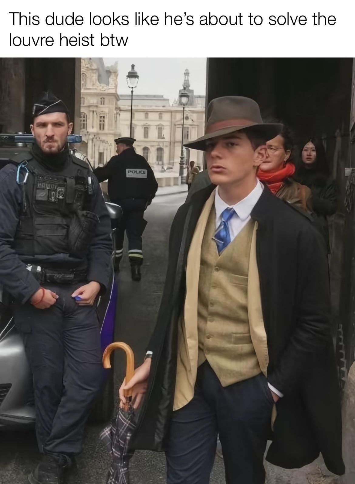 bro dressed up like he’s about to crack the case while everyone else is just trying to get to work