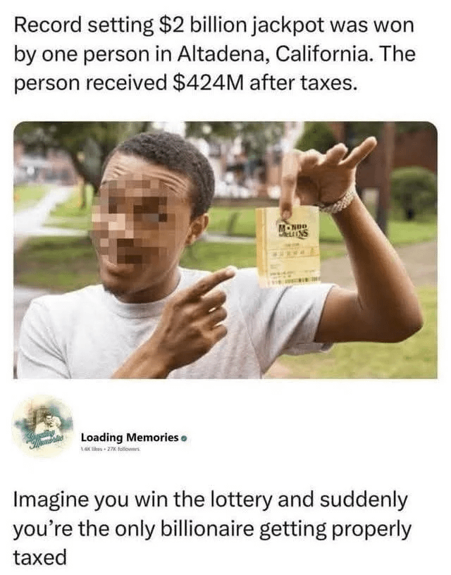 But what I love about this in most cases (not this one specifically) is that even though the winner is still WAY up on their earnings, and the taxes are likely to go to a program that benefits him and his community, people will still say, “well he ONLY won $424mil” like the cuts suddenly make it not worth the value anymore or something. I would be happy for the rest of my life with just 1% of that.