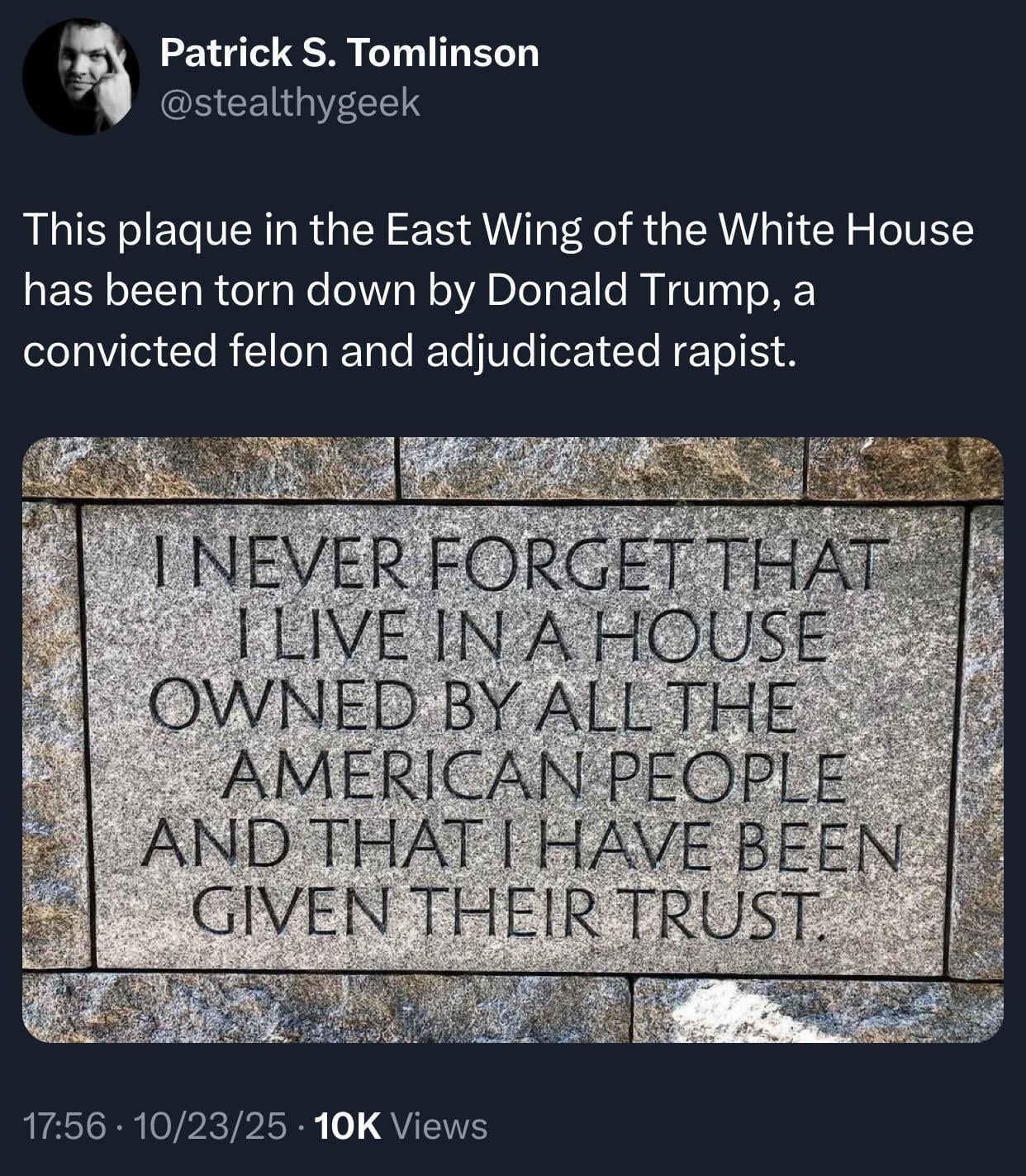 I love shitting on Trump more than most, but this post is inaccurate. That plaque is not from the East Wing. It’s from FDR’s Memorial.