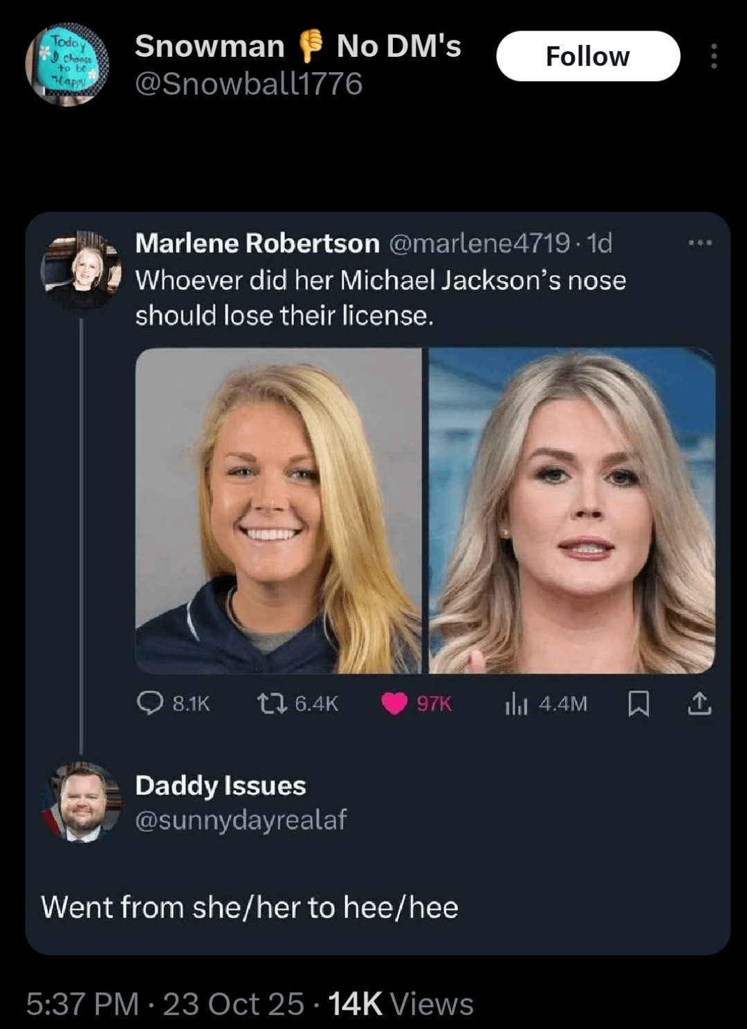 Porunga23 on October 25, 2025 5:25 am That nose job was medically necessary. She can no longer breathe through her nose so she can’t smell the bullshit coming out of her mouth.