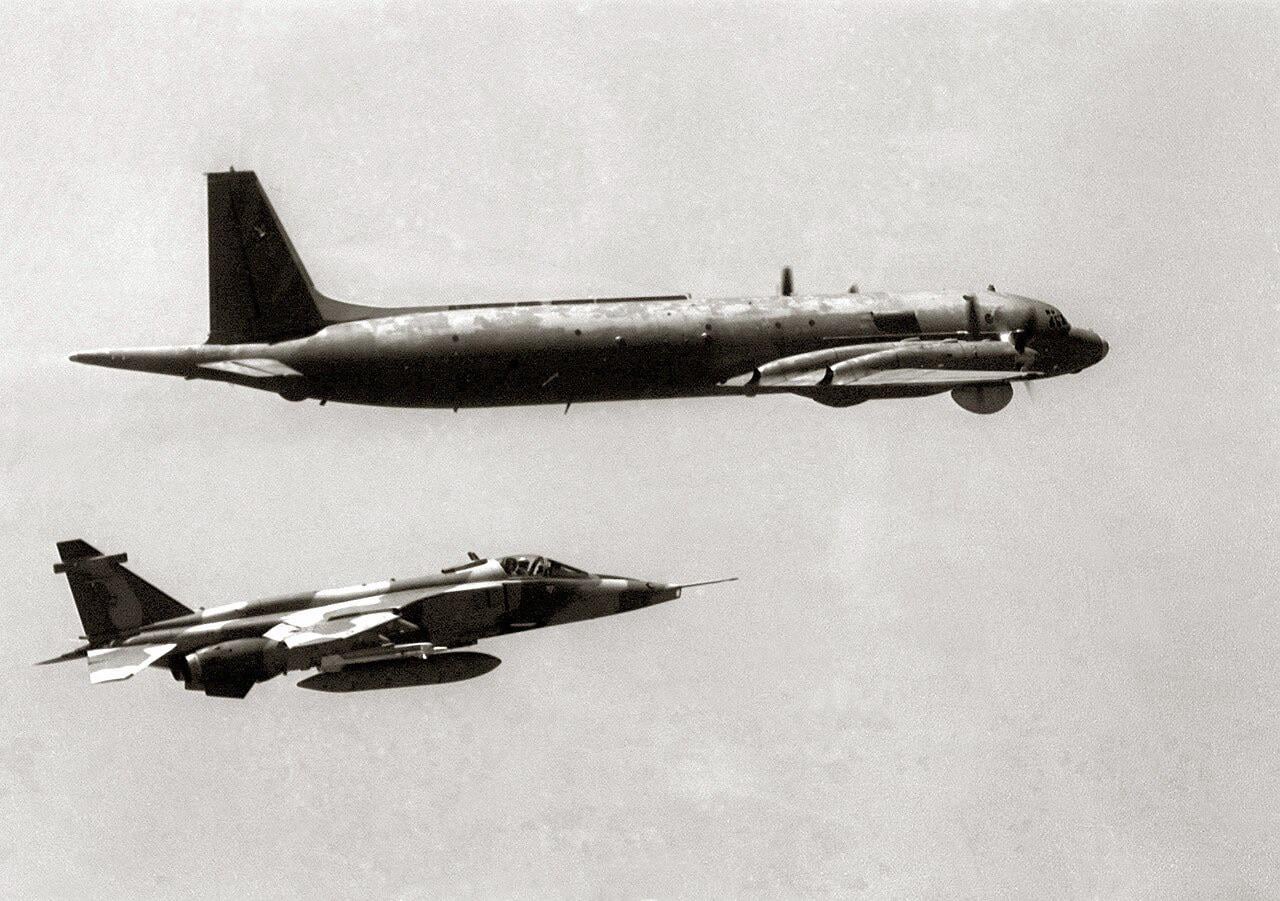 ‘SEPECAT’ Jaguar S(O).1 attack aircraft (with two AIM-9J Sidewinder air-to-air missiles), from the Sultan of Oman’s Air Force (SOAF) – approaching a Soviet Ilyushin Il-38 ‘May’ maritime patrol and ASW aircraft, c. 1987. [1280 x 901]