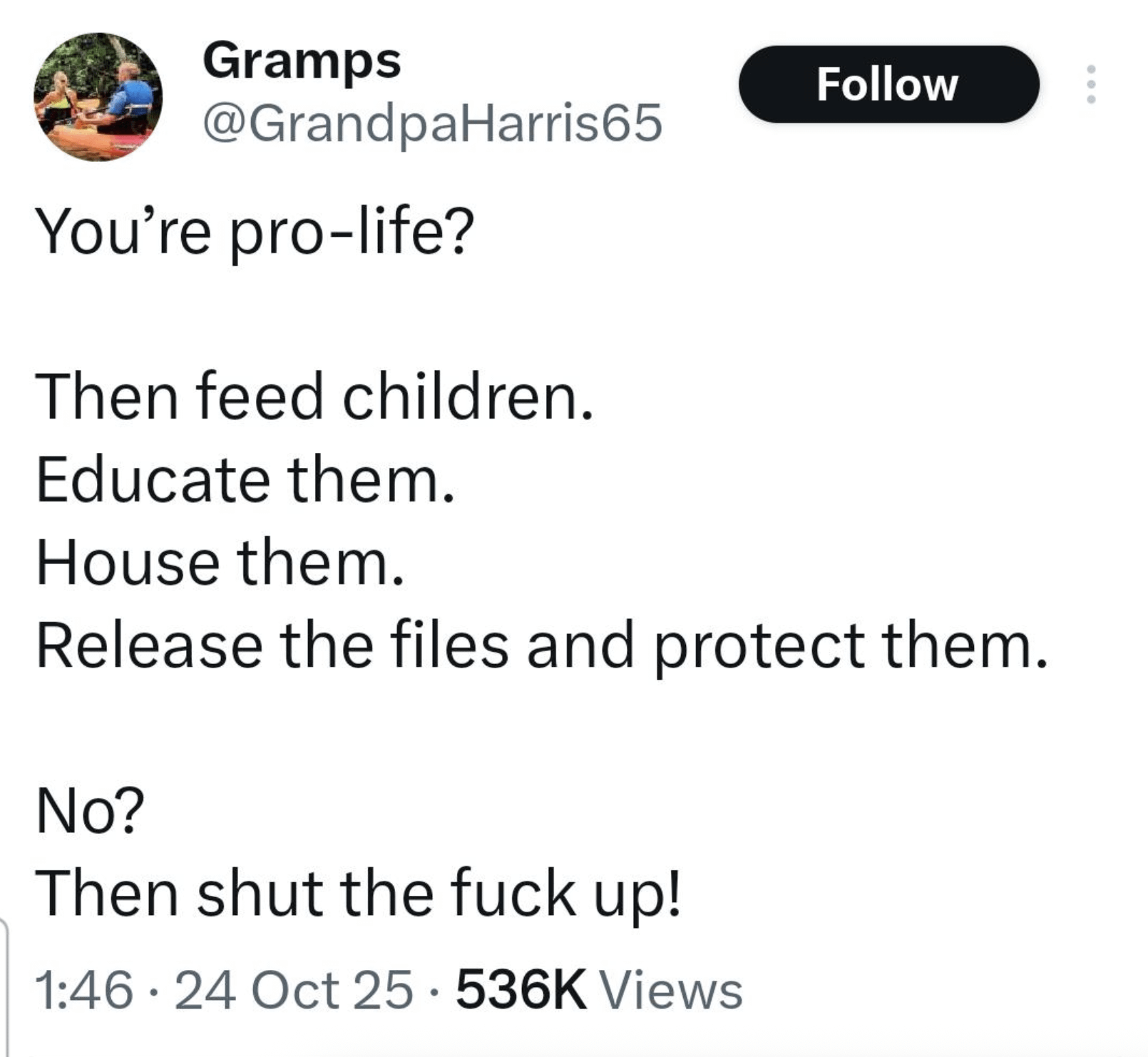 After that, they don’t want to know about you. They don’t want to hear from you. No nothing. No neonatal care, no day care, no head start, no school lunch, no food stamps, no welfare, no nothing. If you’re preborn, you’re fine; if you’re preschool, you’re fucked.”