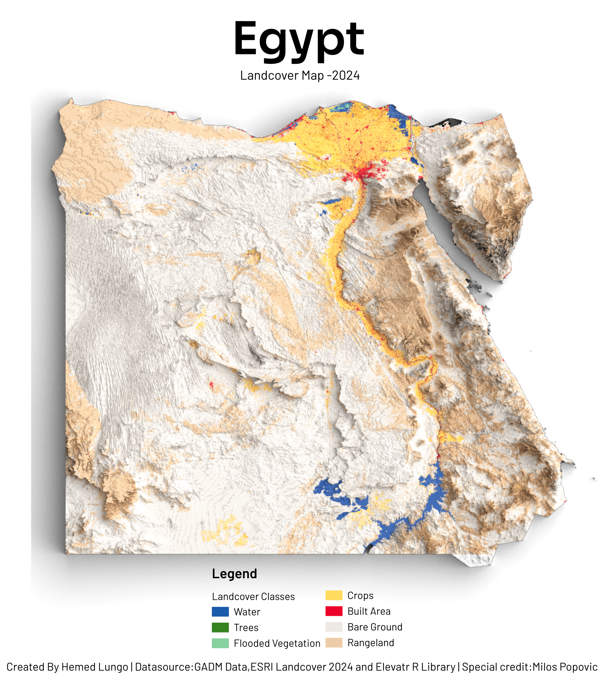 hemedlungo_725 on October 26, 2025 6:46 am Made with QGIS & Blender using: Landcover from EarthMap(ESRI 2024) DEM from Elevatr Library in R programming