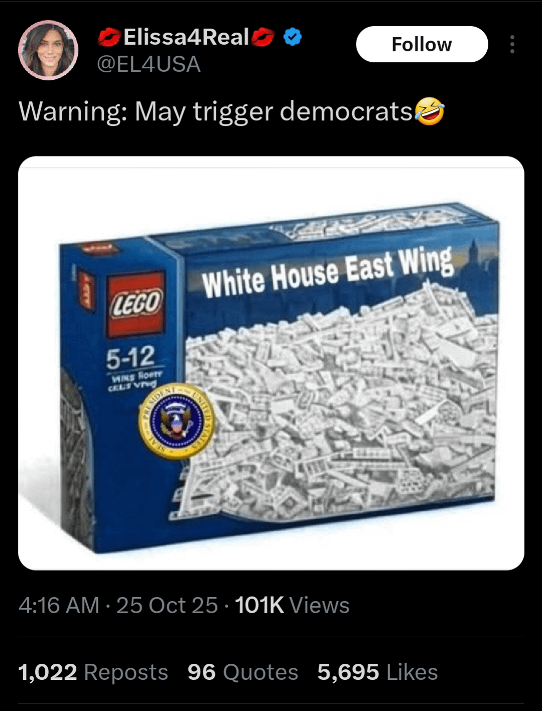 If the destruction of the East Wing doesn’t bother you, then you are not a true American. We are a country that is very, very young. We don’t have many historical things that are as important as OUR house. If you are laughing about this, I assure you, you are no patriot.