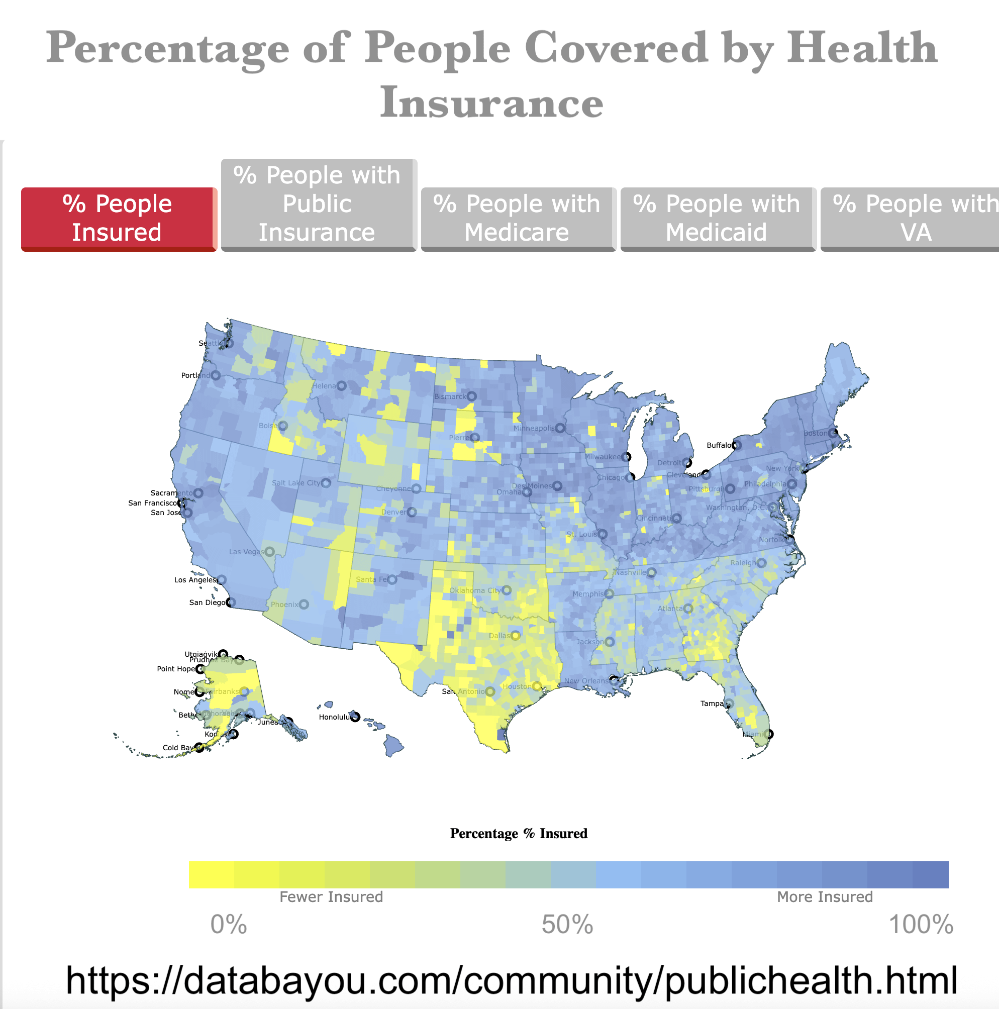 The color label seems to be off on this. I zoomed in on one of the bright yellow areas in Texas near the Arizona border and 66% of the population was insured, not far less than 50% as the color is would indicate