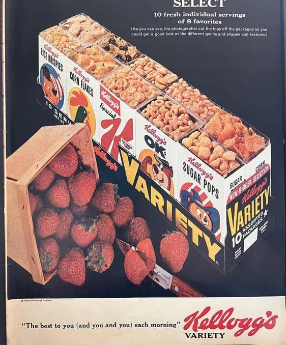 Nowadays those packs of mini-boxes are almost entirely kid-oriented, mostly sugary cereals (plus Rice Krispies with those three noisy sprites: children of course dumped sugar on it), but back in the day they were more like this, mostly minimally sweetened adult cereals with some children’s treats thrown in.