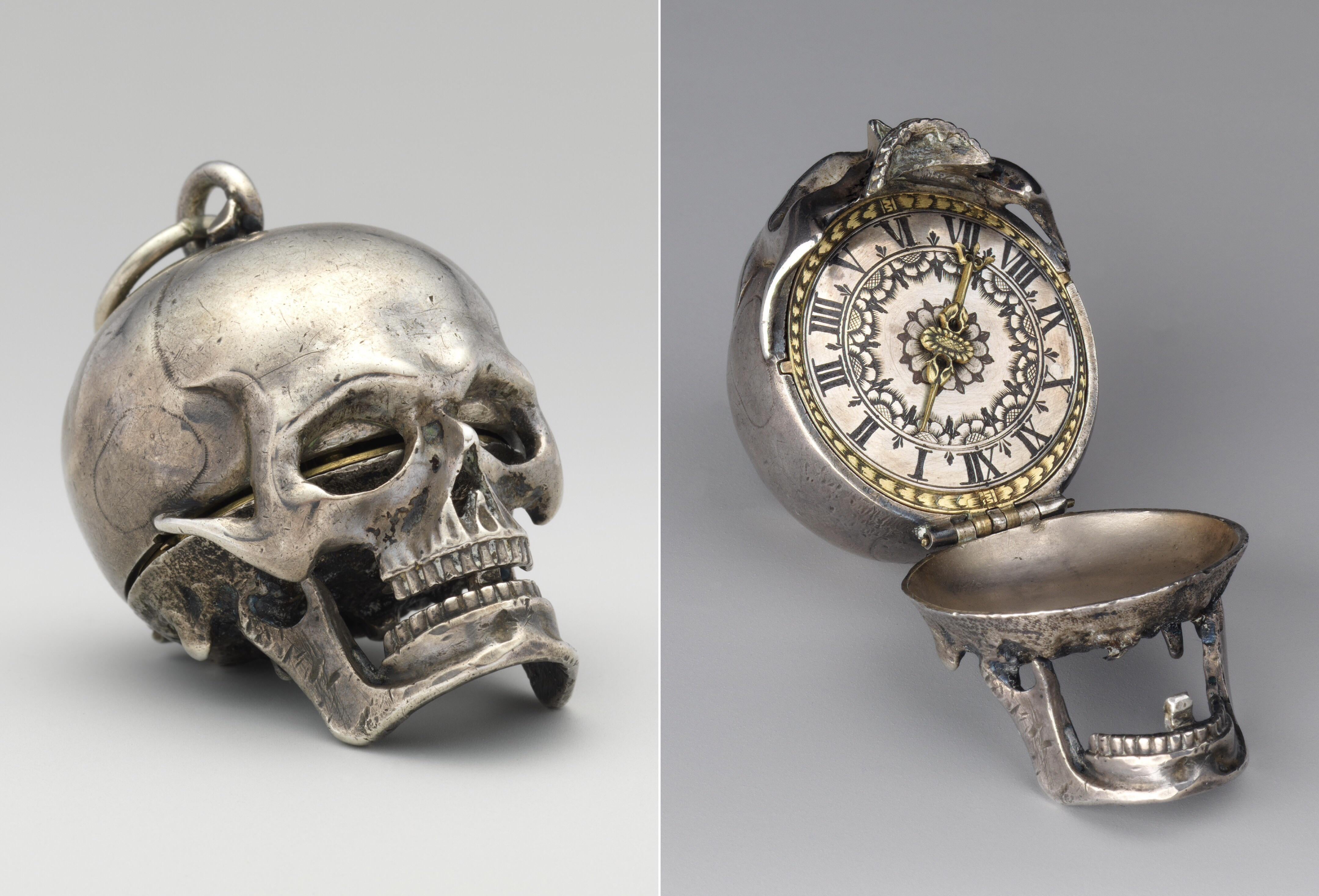 Among those who subscribed to the Calvinist form of Protestantism there was an inherent focus on time, and watches counted the hours. The skull-shaped watch was one of the products of this tradition, and while some of these watches were made in southern Germany, more of them seem to have been made in seventeenth-century Blois, a center of Calvinist, or Huguenot, watchmakers in France. But the theocracy established in 1541 by John Calvin (1509– 1564) became the prime source of watches with cases in the shape of human skulls in seventeenth- century Geneva. The earliest of these watches is thought to have been made by Martin Duboule (1583–1639) and is now in the collection of the Musée du Louvre. A watch in the Metropolitan Museum’s collection made by Pierre Landré of Blois is not unlike the Duboule watch, and both are believed to be from about 1630. Skull watches continued to be made throughout the eighteenth century in Geneva, and the local firm of Moulinié, Bautte and Moynier was still making them in the early years of the nineteenth century.