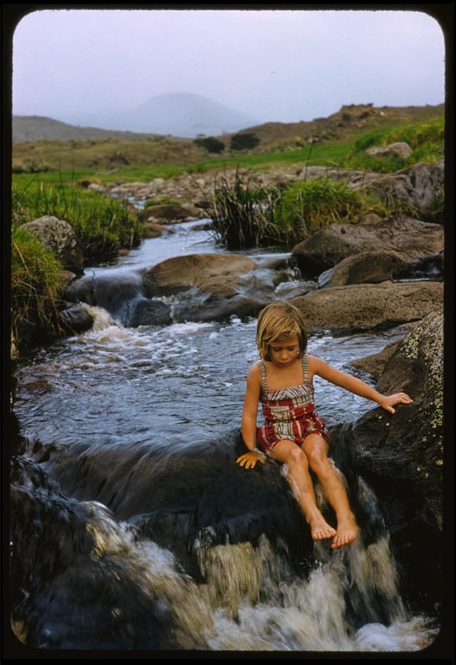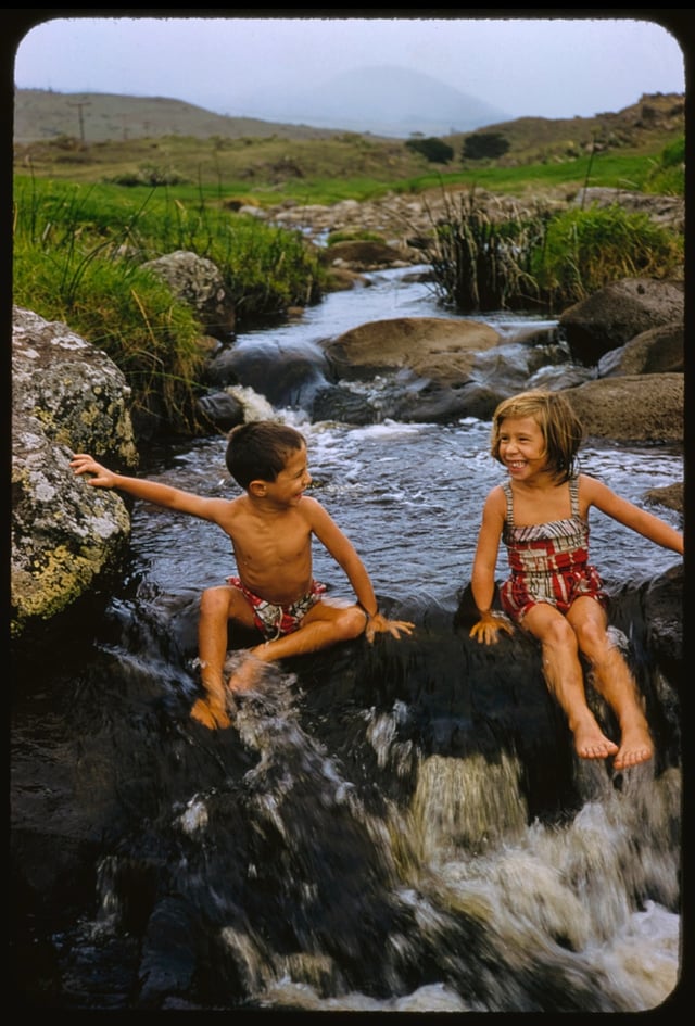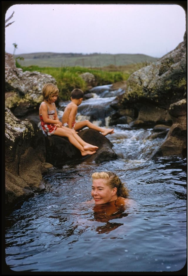 Kids play in the creek while mom swims in the deepest part, somewhere in Hawaii, 1957, kodachrome slides by Electrical-Aspect-13
