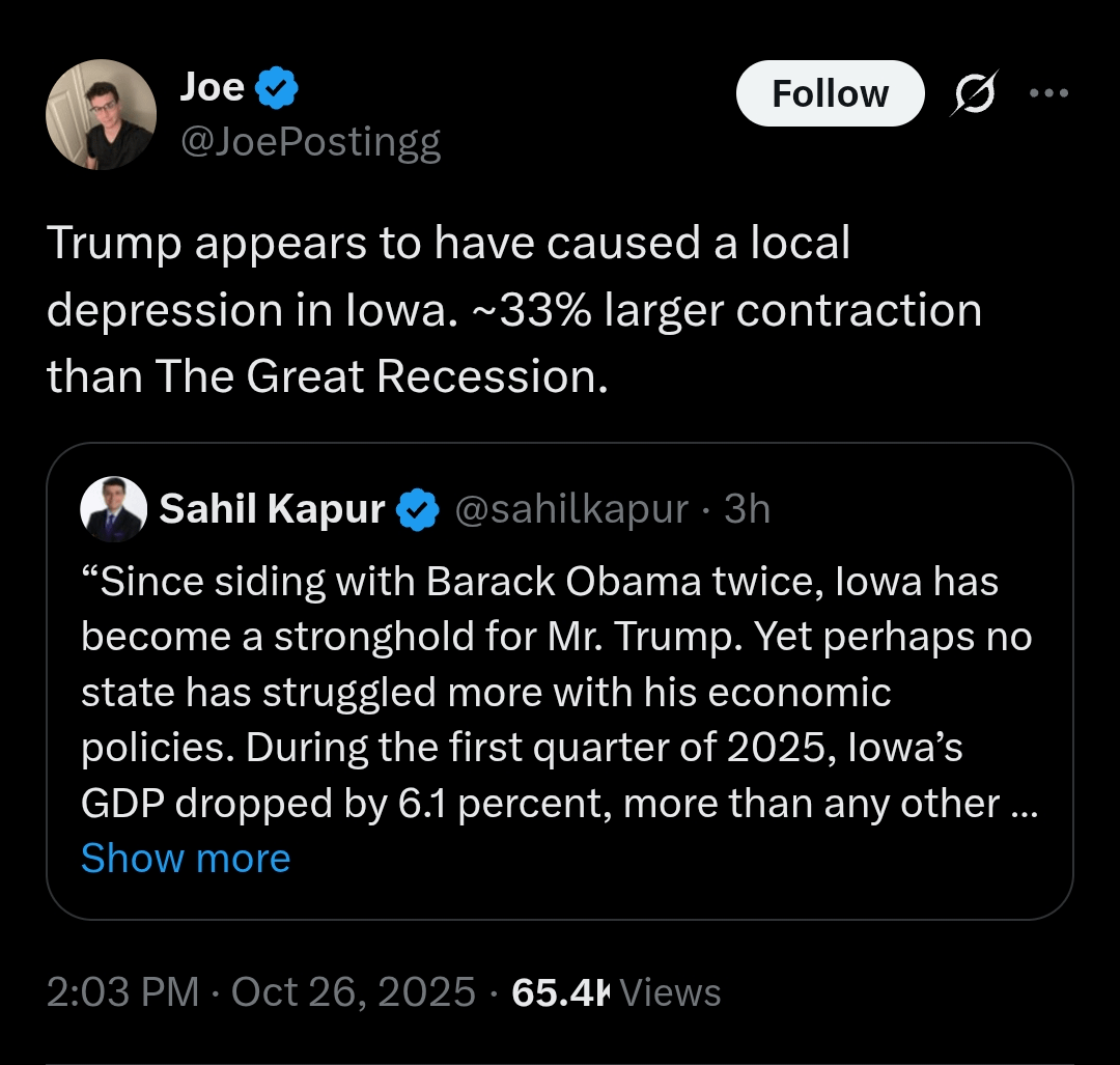 Iowa farmers having a shitty year, going bankrupt, getting their farm ms repossessed? They voted for Trump’s tariffs.