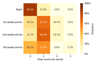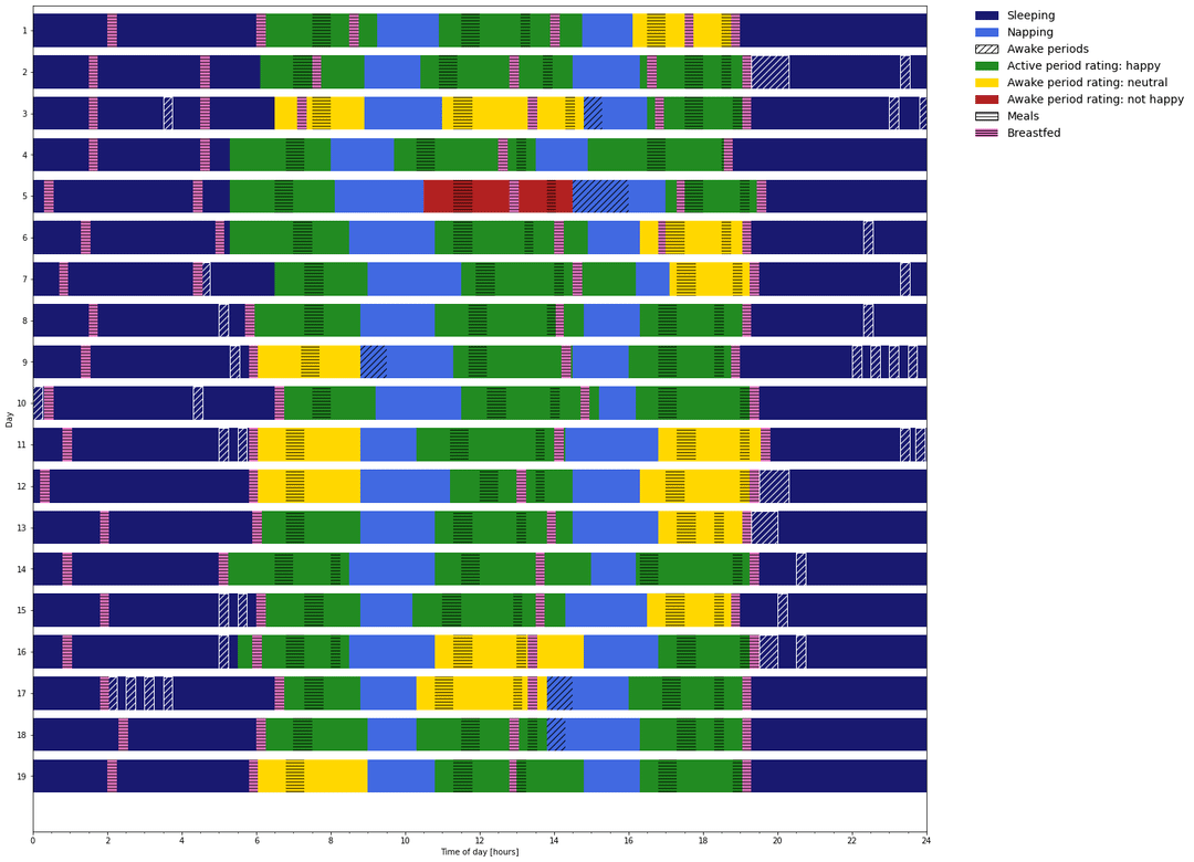 I have been noting down some details of the day of my 10-month old. It takes few minutes every day, and it starts to look like a nice dataset to plot. I have received some good feedback just before the previous post was deleted, and the new graphs include some small changes because of that.