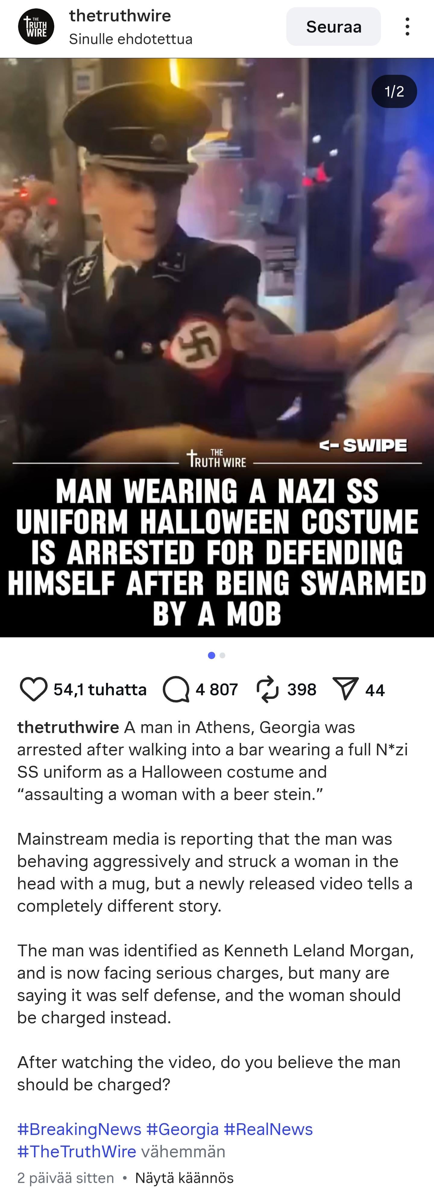 *”A man in Georgia dressed as a Nazi SS officer was arrested after he allegedly broke a woman’s nose with a beer glass after he was kicked out of a bar”*
