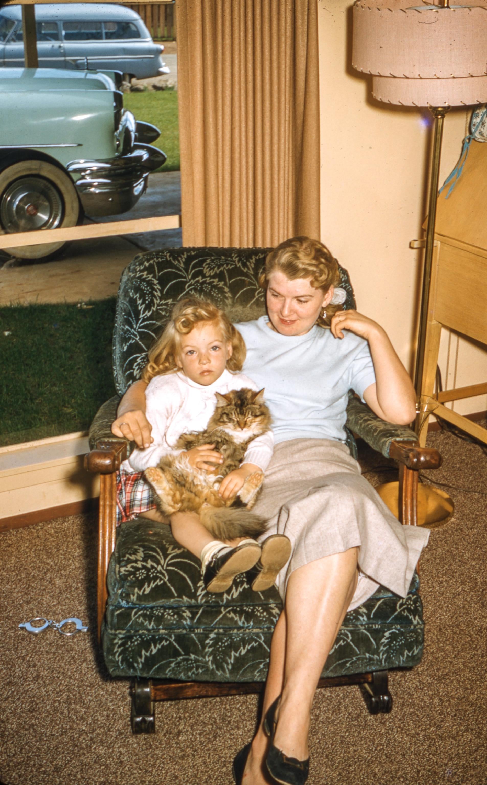 Young mother posing with her little daughter in her arm chair with the little one holding her cat. Kodachrome circa 1950s. by Electrical-Aspect-13