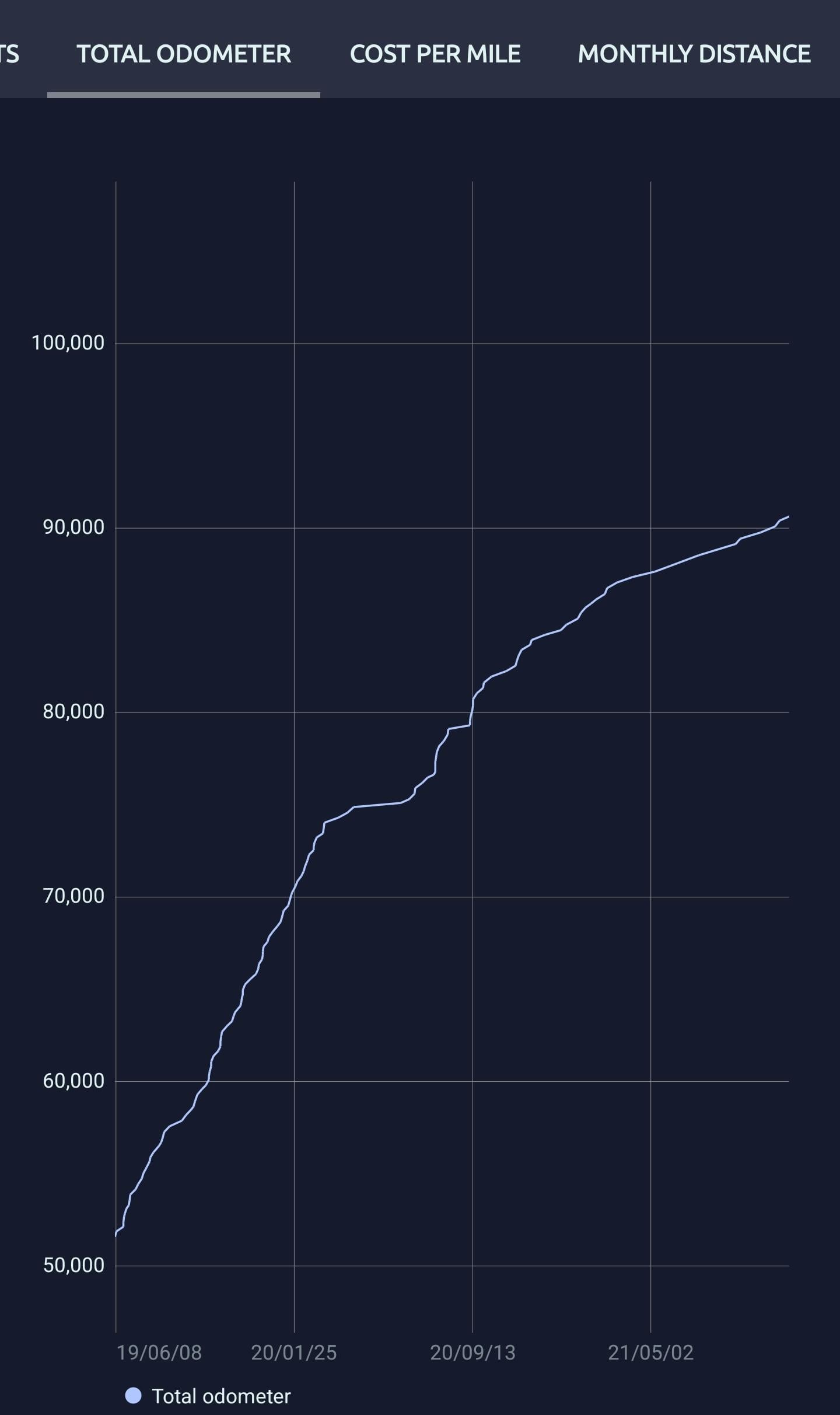 Prior to the pandemic, my mileage accumulation was very steady. When the world shut down, I didn't drive for about 3 months, apart from the occasional trip to the grocery store. Post pandemic, my ability to travel was very limited, resulting in inconsistent travel and a reduction in overall mileage per year.