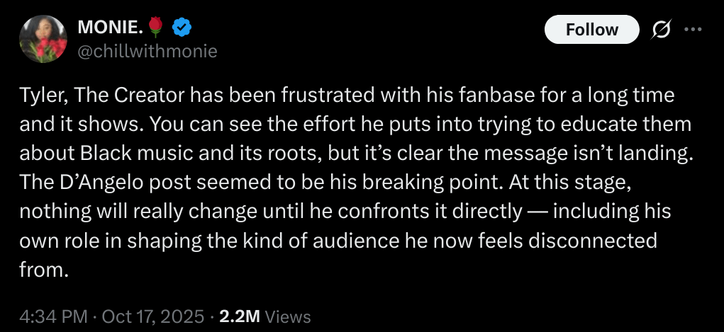 There is no material benefit to rejecting that fanbase and opening the can of worms that is apologizing on social media. Since the reality is we live in a punitive society where everyone is a major skeptic of each other. Certain people will never support Tyler because of how he used to be or an inability to believe he can change. So I do not see why he would publicly address this unless he personally feels super invested in getting rid of that fan base even if it’s largely to the detriment of his career.
