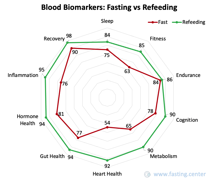 An extended fast is a stress for the body, so most biomarker categories dropped during fasting. After a month of refeeding, nearly all systems rebounded, with 7 out of 10 improving beyond their pre-fast levels.