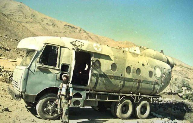 A man poses with his custom-made bus by combining a Mil Mi-8 helicopter fuselage and a KamAZ truck. (Afghanistan, late 1980s)