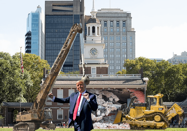 Next up: Trump to demolish Independence Hall in Philadelphia, stating, “That’s where they passed the Declaration of Independence and the Constitution. I hate that shit!”