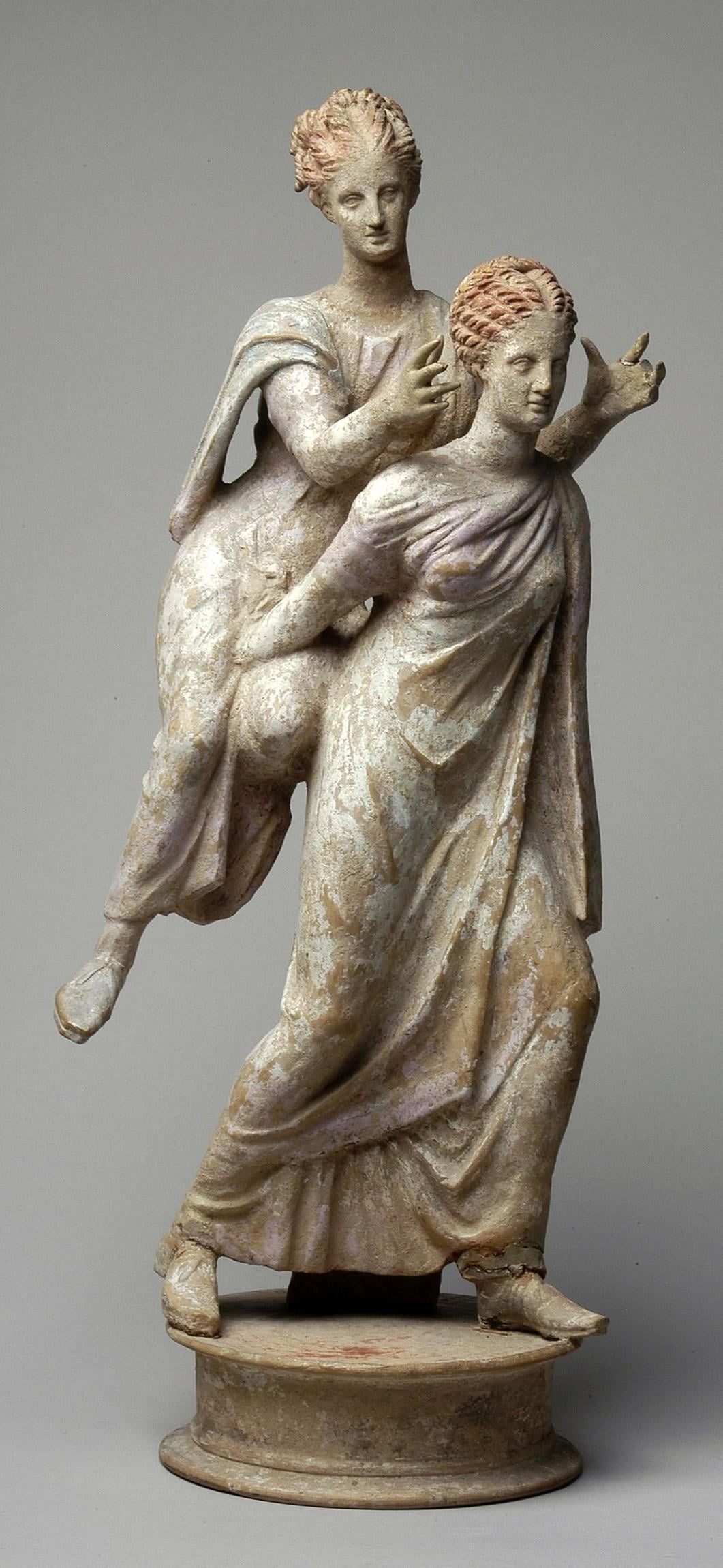 A ceramic sculpture depicting two girls playing the Ephedrismos game with one carrying the other on her back. From Corinth in Greece, c. 300 BCE, now housed at the Allard Pierson Museum in the Netherlands [1061×2300]