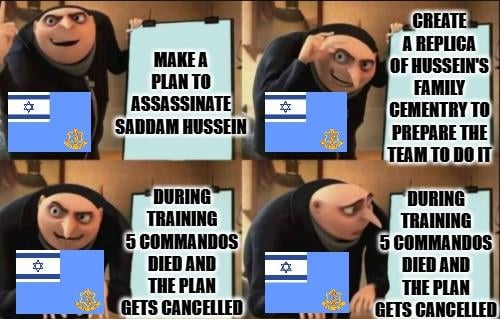 The members of the hit team drilled with live missiles, while members of the unit’s intelligence and administrative staff played the part of Saddam and his entourage. The commandos fired live rounds at a convoy simulating the target after mistaking a “dry run”, where a soldier posed as Saddam waving at crowds, for a “wet run”, where Saddam’s part was replaced by a mannequin due to weariness from the training as well as poor planning to the point where the same code word was used for both a “dry” and “wet” run. As a result, the commandos fired two missiles at their fellow soldiers simulating Saddam and his convoy, one of which hit the middle of the convoy while the other landed a few yards away. Five soldiers were killed and six wounded. The plan was cancelled.