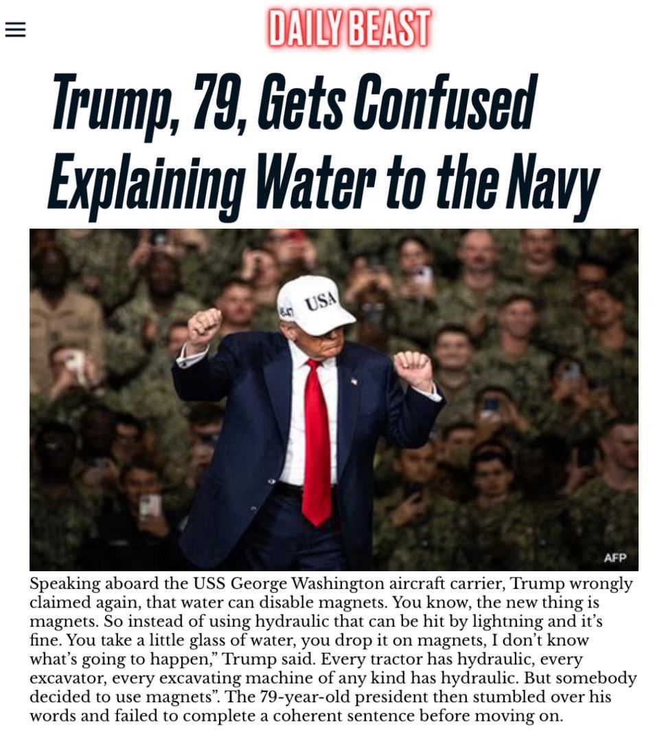 Trump went on a deranged rant about the power of water to destroy magnets during a rambling address to the U.S. Navy just off the coast of Japan.