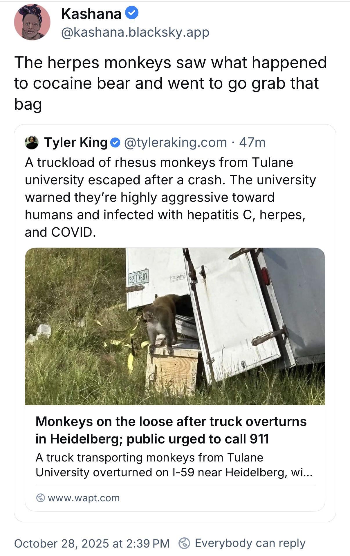 idlefritz on October 28, 2025 9:17 pm rhesus getting payback for that herpes I’m in a neighboring state but watching my 6 anyway