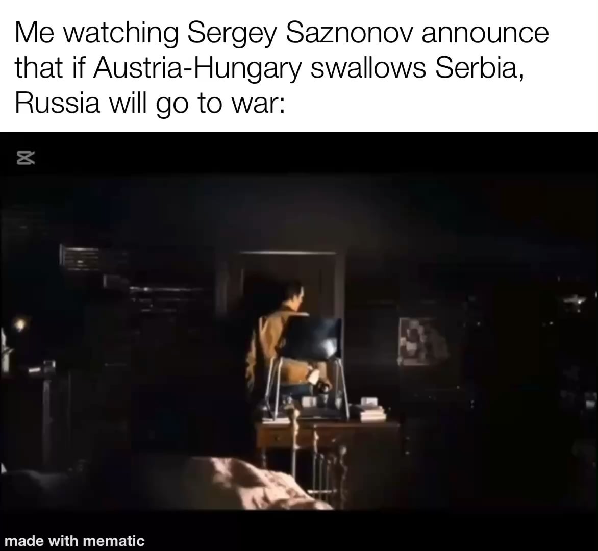 When Friedrich von Pourtalés (German ambassador to Russia) met with Sergey Sazonov (Russian foreign minister) to convince him to cancel Russian mobilisation (as Russia wanted to protect Serbia), Sazonov refuses, telling Pourtalés, “if Austria-Hungary swallows Serbia, we will go to war.” Pourtalés, however, thinks little of this statement – he had no idea that Austria-Hungary had zero intention of annexing any Serbian land.