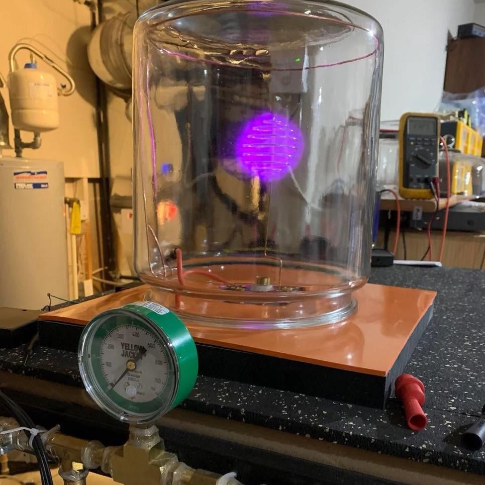 Curious if you’re also using a heated tungsten coil for thermionic emission (like a cathode ray tube), but that little coiled globe in the center looks like just straight up copper, so my guess is tesla coil?
