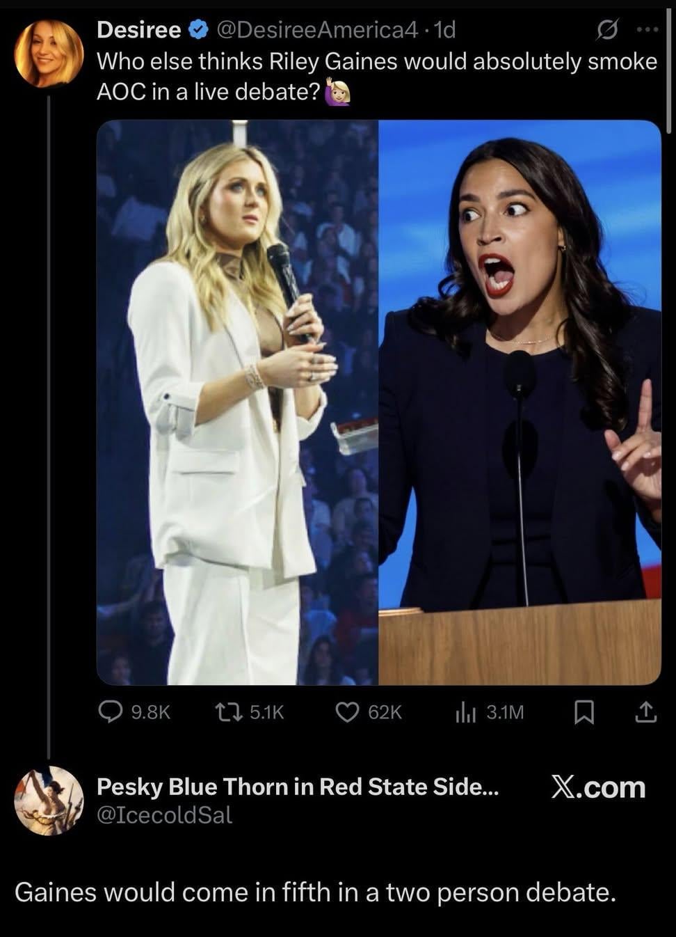 EmJayBee76 on October 29, 2025 9:43 am Ryan Lochte has a better chance at winning a debate against aoc than Riley Gaines Edit: added “than Riley Gaines”