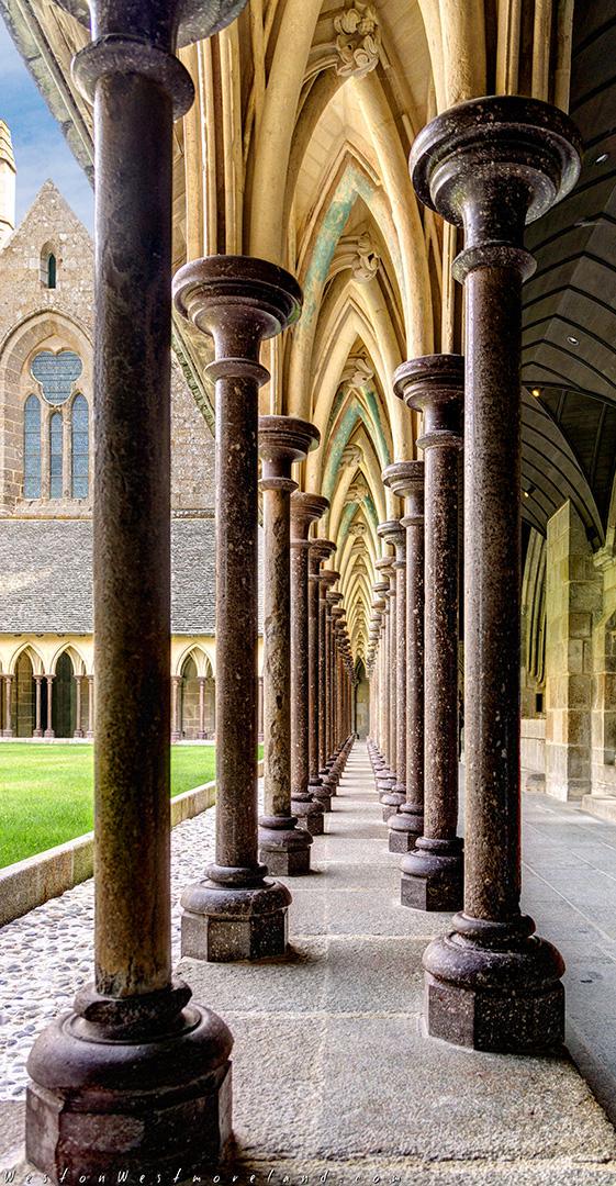 Alternate colonnade, Mont-Saint-Michell abbey cloister, 12th century, France. Contrary to tradition, the cloister was neither built at the center of the building nor enclosed, but on the side, and with wide windows to the landscape far below. The view surely helped relax and meditate [1080×561] [OC]