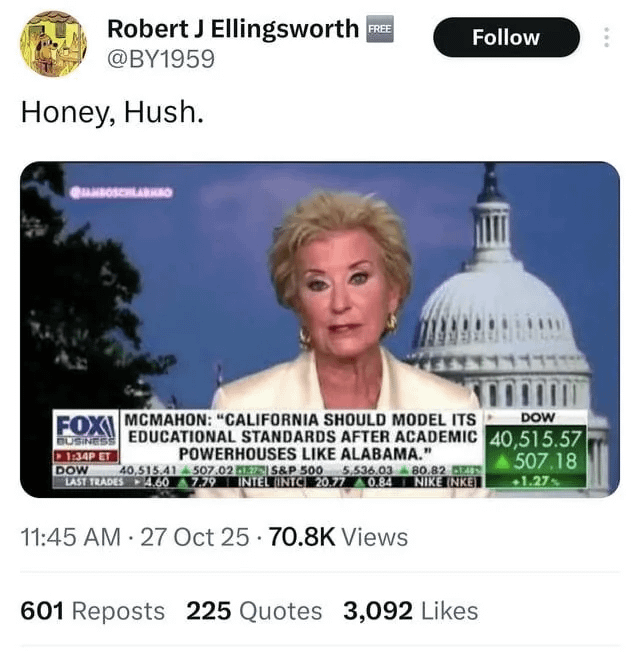 She’s just following the trump way. State something totally false and outrageous and keep saying it till dumb dumbs believe it’s true. I guarantee that there are people out there right now bragging about Alabama’s education “model”