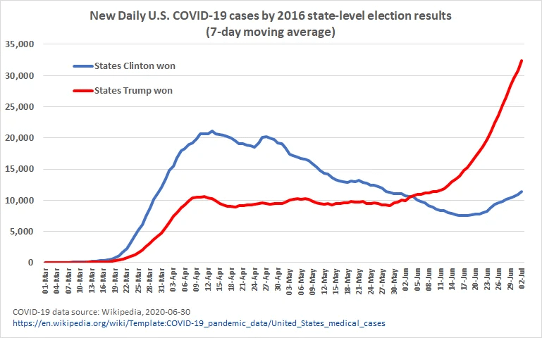 I think some of this is driven by location. Republican voters are clustered in the South. Texas, Florida, the deep South. People who live in that area are indoors in the summer and that’s when covid really spread.