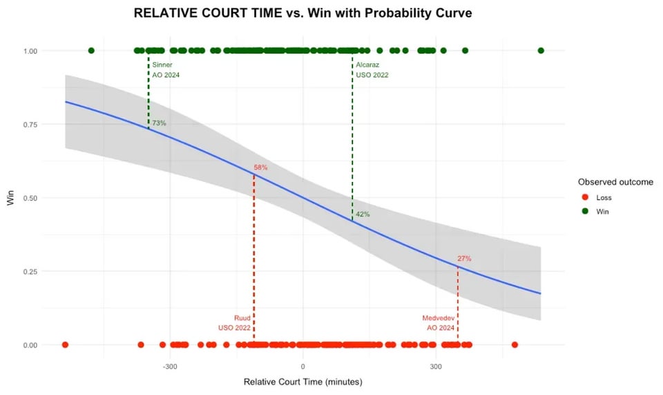 We published an article, where we look at 30+ years of data to analyse the impact of total time and relative time on court. The graphs below show the shift in win probability between the two models. If you think this is interesting and want to read more the link is below. Any feedback welcomed