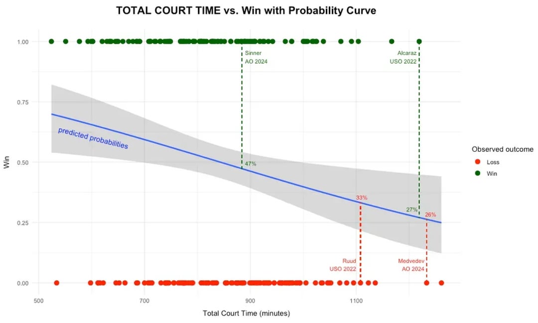 The fact that your prediction of win probability decreases as court time increases — meaning more of it makes you less likely to win — suggests it’s a proxy for fatigue or something. Is it the number of minutes your matches have lasted in a given tournament?
