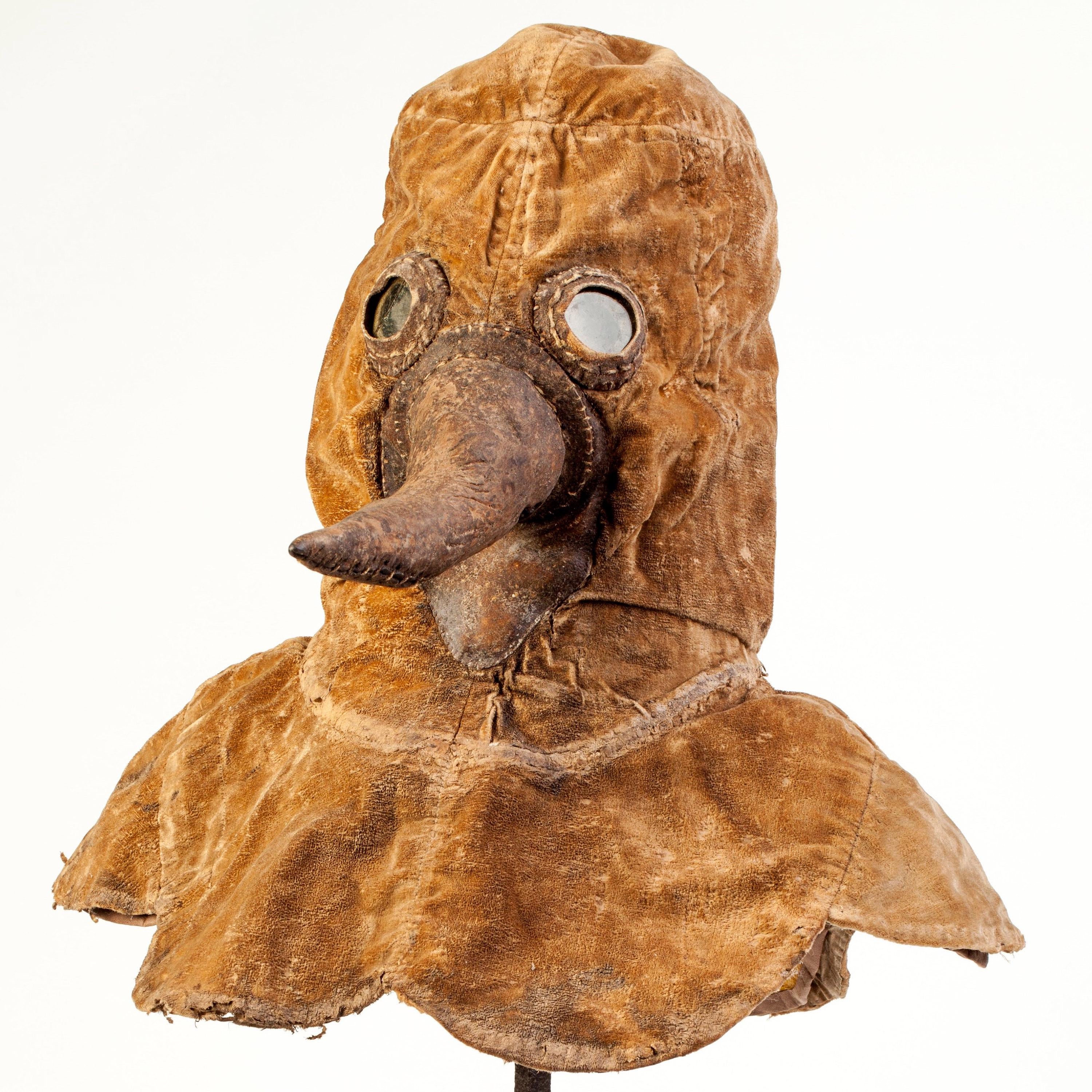 [Museum](https://artsandculture.google.com/asset/mask-supposedly-worn-by-plague-doctors/WQE-ipZ0_sshvA). To protect against epidemics, plague doctors and plague healers wore a leather gown with a wrap and a mask-like headgear tightly enclosing the entire head. In its beak-shaped projection, the nasal protection, were herbs or sponges soaked with vinegar, which were supposed to protect the doctor from infection in direct contact with the infected person.