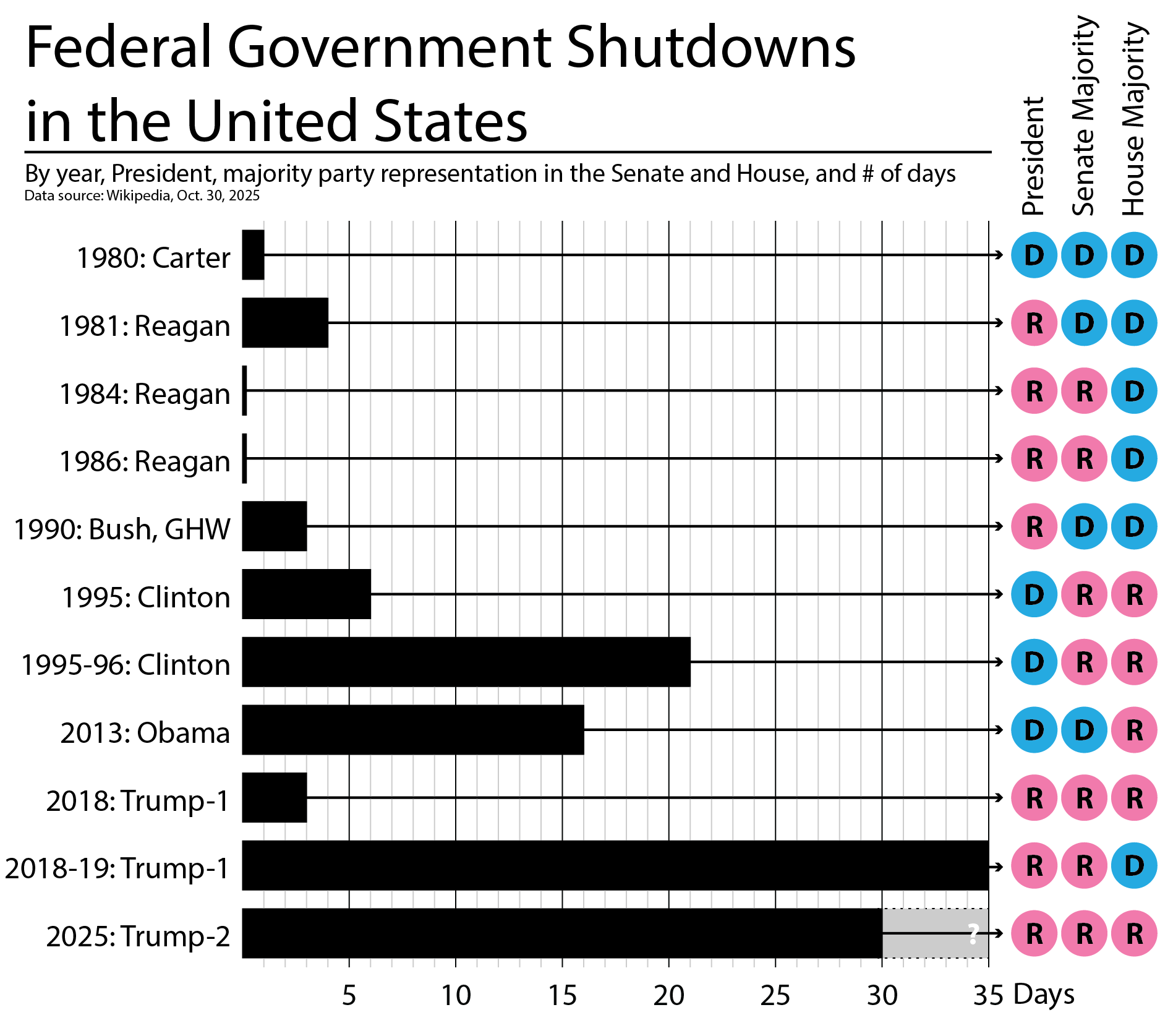 Created in Illustrator, data gathered from Wikipedia Oct. 30, 2025: [https://en.wikipedia.org/wiki/Government_shutdowns_in_the_United_States](https://en.wikipedia.org/wiki/Government_shutdowns_in_the_United_States)