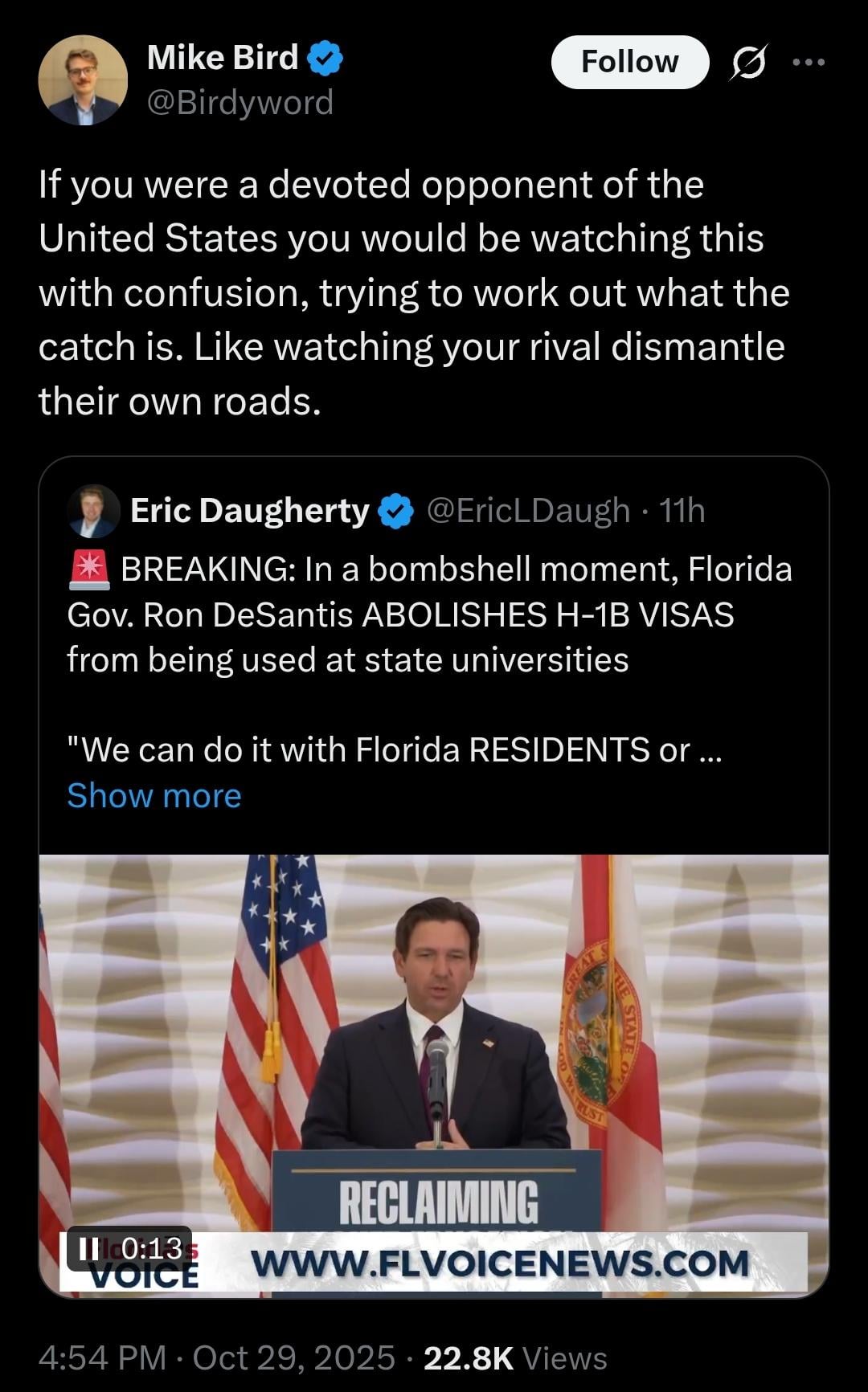 This is DEI. If they were all about qualifications and having the best people to work in florida, wouldn’t eliminating the H1B visas be detrimental to that claim. And INCLUDING only Florida residents as the options means DEI hires. Fascinating.