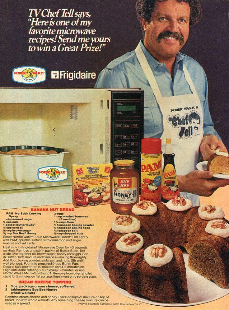 1982 ad for Nordicware microwave ovens featuring TV figure “Chef Tell”. Cooking banana bread or cake in this manner is certainly unusual and unique. by HawkeyeTen