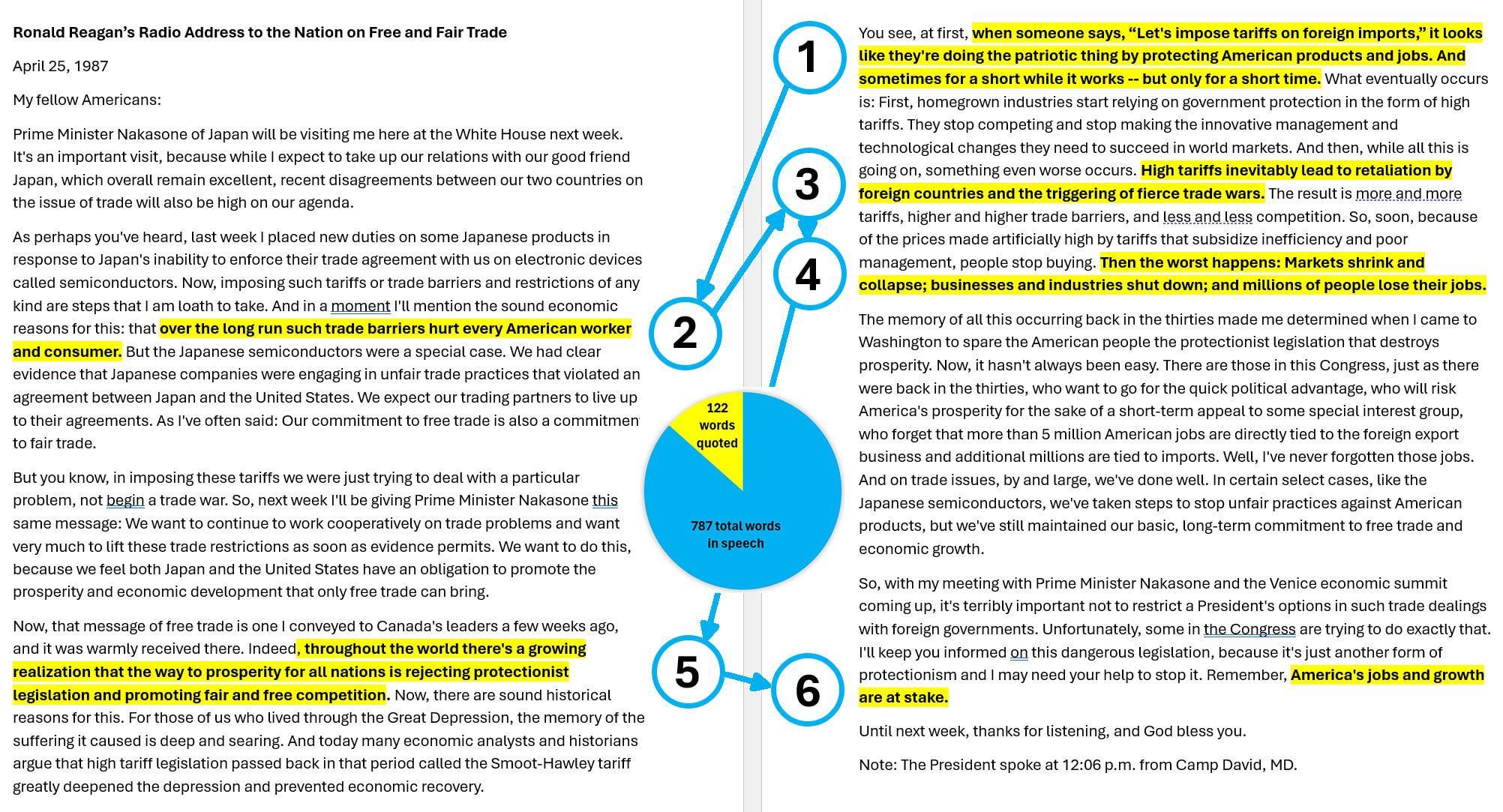 The image shows the order of the phrases quoted in the ad in comparison to the entire speech. The phrases were used out of order in the ad, but all of the phrases were in the original speech. 122 words quoted in the ad out of 787 total words in speech results in 15% of the total speech quoted in the ad.